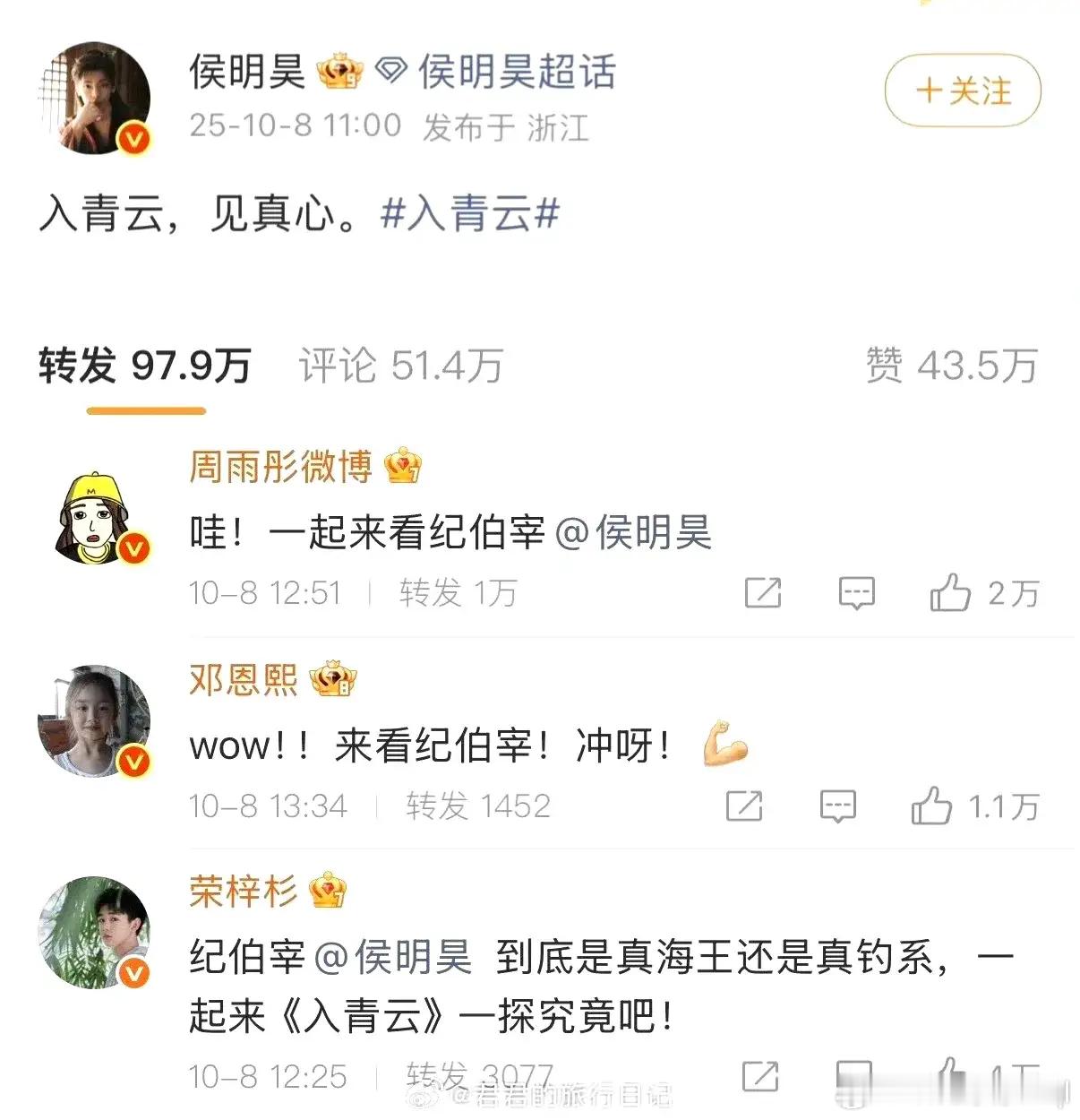 侯明昊的新剧开播时,帮忙宣传的是周雨彤、荣梓杉、邓恩熙。 花少6小团体好明显