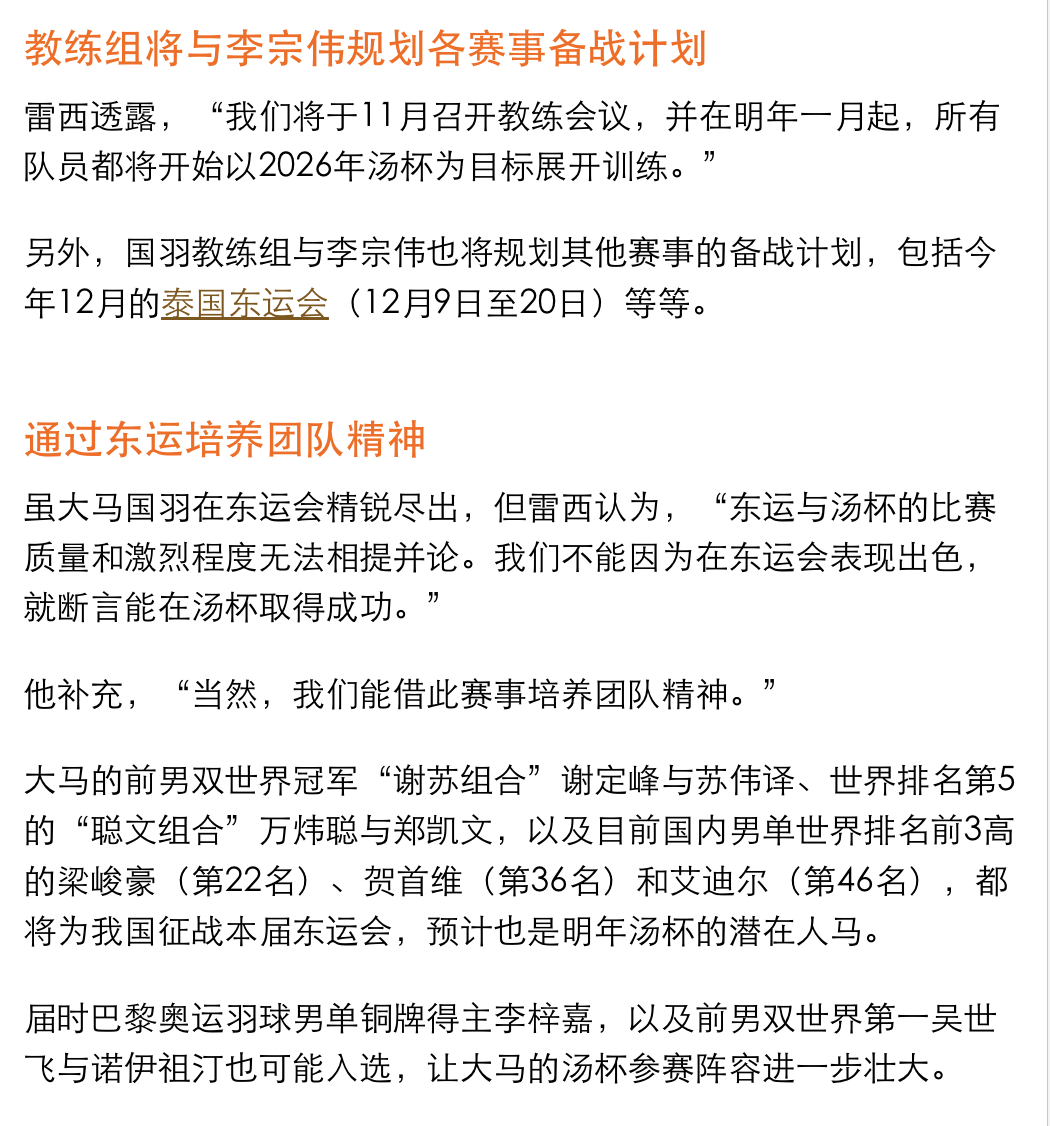“若想在汤杯发起有力挑战,我们不能等到开赛前1到2个月才开始备战。”雷西进一步称,自大马传奇拿督斯里李宗伟就任大马羽总绩效委员会主席后,大马国羽便决定必须立即开启备战工作。