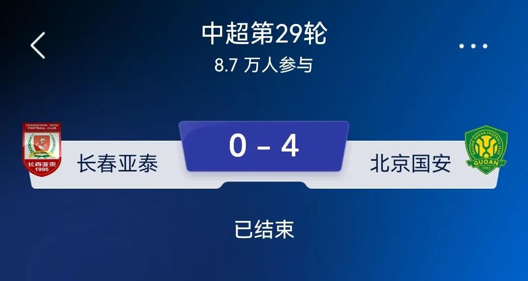 老东家不留情面,北京国安4比0大胜长春亚泰,苏亚雷斯提前一轮带长春亚泰降入中甲,长春亚泰让谢晖下课,高薪请了苏亚雷斯救火,想不到苏亚雷斯让长春亚泰提前降级了,长春球迷终于不需要再受折磨了,明年长春亚泰又争取杀回来吧!长春亚泰加油。!