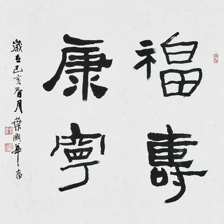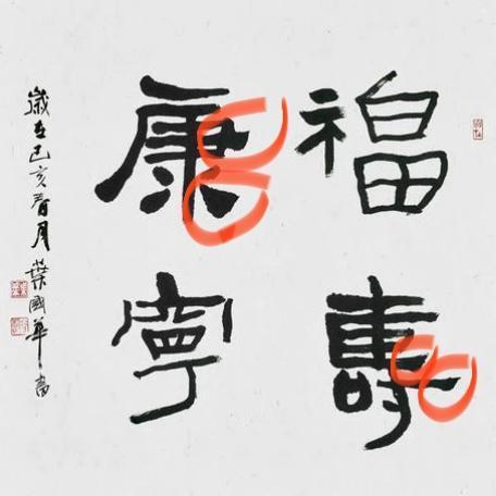 隶书不能违反规则:"雁不双飞"!台湾书法协会主席叶国华先生书法如何?今天看了他的一幅四尺斗方的四字隶书,总体上看书法写的已是相当棒了,讲究章法,"福"与"宁"对角两个字字笔划细,而"寿"与"康"二字,笔划用墨重,笔划粗。而且整体显得很有拙味。 但此书法也有还足,隶书讲究"雁不双飞",可是"寿"的相邻的两横划,有同样大小的两个雁尾,而"康"字的一横和最后一点,也是两个雁尾。这是隶书书写上的大忌。