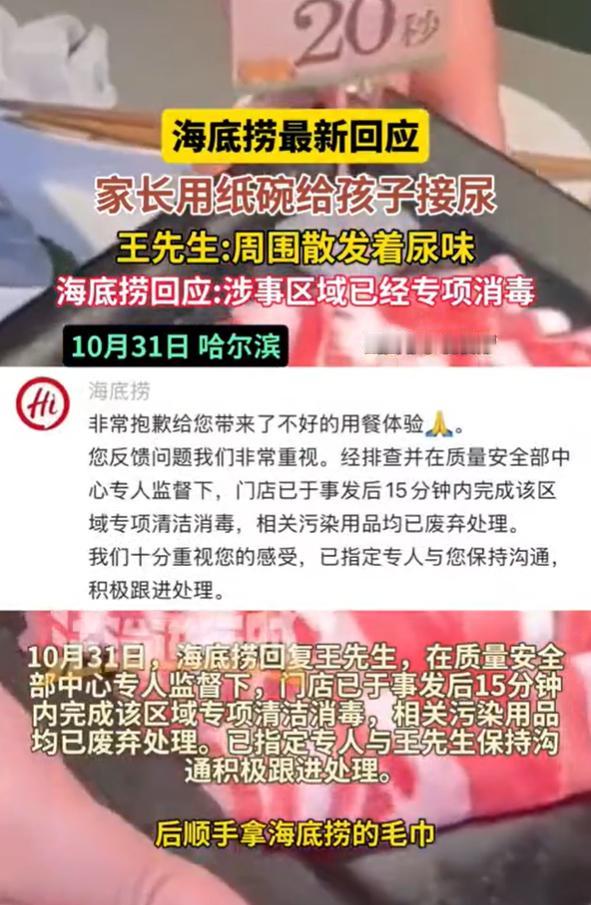 可怜的海底捞,又和“尿”干上了!当妈的直接用吃东西的纸碗给孩子接尿,完事了还把有尿的纸碗直接放推车上,你说恶心不? 看到这条新闻,我不仅心痛海底捞3秒钟…… 前阵子上海发生的“海底捞小便门”,法院才给判了220万的天价赔偿,结果还是不让人省心! 这一次事发黑龙江哈尔滨。 10月30日,有网友在哈尔滨一家海底捞吃饭,对面桌一个宝妈的动作,恶心的他们完全没有了食欲…… 当时那桌一个小孩要撒尿,宝马顺手就拿起一个纸碗,让孩子直接尿纸碗里! 先不说,这么大孩子光屁股站在餐厅里撒尿合不合适,就说这接完尿的纸碗吧……这女的居然直接放在了搁菜的推车上,然后还用海底捞的毛巾擦了擦手上的尿液! 爆料网友看到了这一幕,也不知道是不是心理作用,瞬间就闻到空气里除了火锅味道,居然还散发着一股子尿骚味? 网友实在是看不下去了,立刻找到海底捞服务员反映情况。 海底捞这边估计也是如临大敌,赶紧先安抚这名网友的情绪,又赠送了一个果盘…… 结果网友表示,自己鼻子里全是尿骚味,什么果盘也吃不下去,老恶心了!看来,大家是被上海的“小便门”事件给整出心理阴影了! 海底捞应该也是非常重视这件事,毕竟有前车之鉴,一泡尿影响的可不止一两个客人的食欲,对品牌的伤害无法估量啊! 于是,这家门店也尽了自己最大的努力,将整个区域进行了全面消毒处理,相关污染物品全部报废处理,还指定了专人和这名网友沟通解释。 不过,整个处理过程中,海底捞并没有提到那名母亲,看来门店是打算全力扛下这一切了! 其实,这种不文明不卫生的行为,应该要明确提出和制止!务必要让某些人知道事情的严重性,才能引以为戒…… 孩子的尿能有多脏?小题大做!可能宝妈会有这样的逆反情绪,但是不能助长此类错误认知泛滥! 你的孩子尿不脏的话,你自个接着即可,哪怕是接你自己的碗里,也没人说什么,但是不能无关之人承受这一切! 不知道这位宝妈此时此刻会不会在浏览头条,这条新闻今天爆的多,或许她自己已经心知肚明,端看其自我认知怎么样了,希望能知错就改吧……