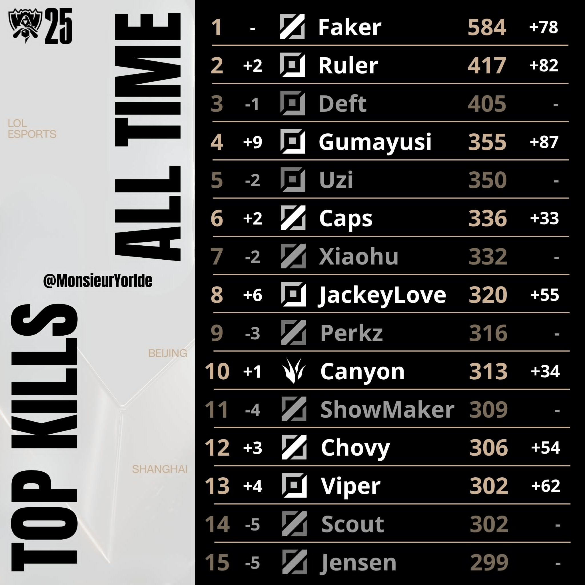 虎扑11月01日讯外媒统计全球总决赛总击杀数榜单,具体如下: