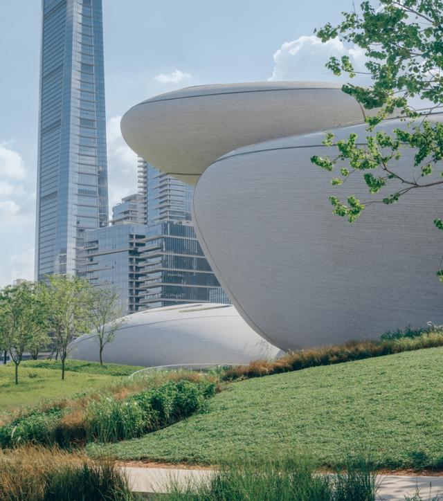 展馆主体巧妙隐入草坡屋面之下,连绵起伏的绿地与人才公园无界相连,并通过两座人行天桥与城市绿轴的中心绿带、万象城商业区、深圳湾有机衔接。人们穿行其间,在自然、建筑与城市的交融中,打开对设计之都的想象。