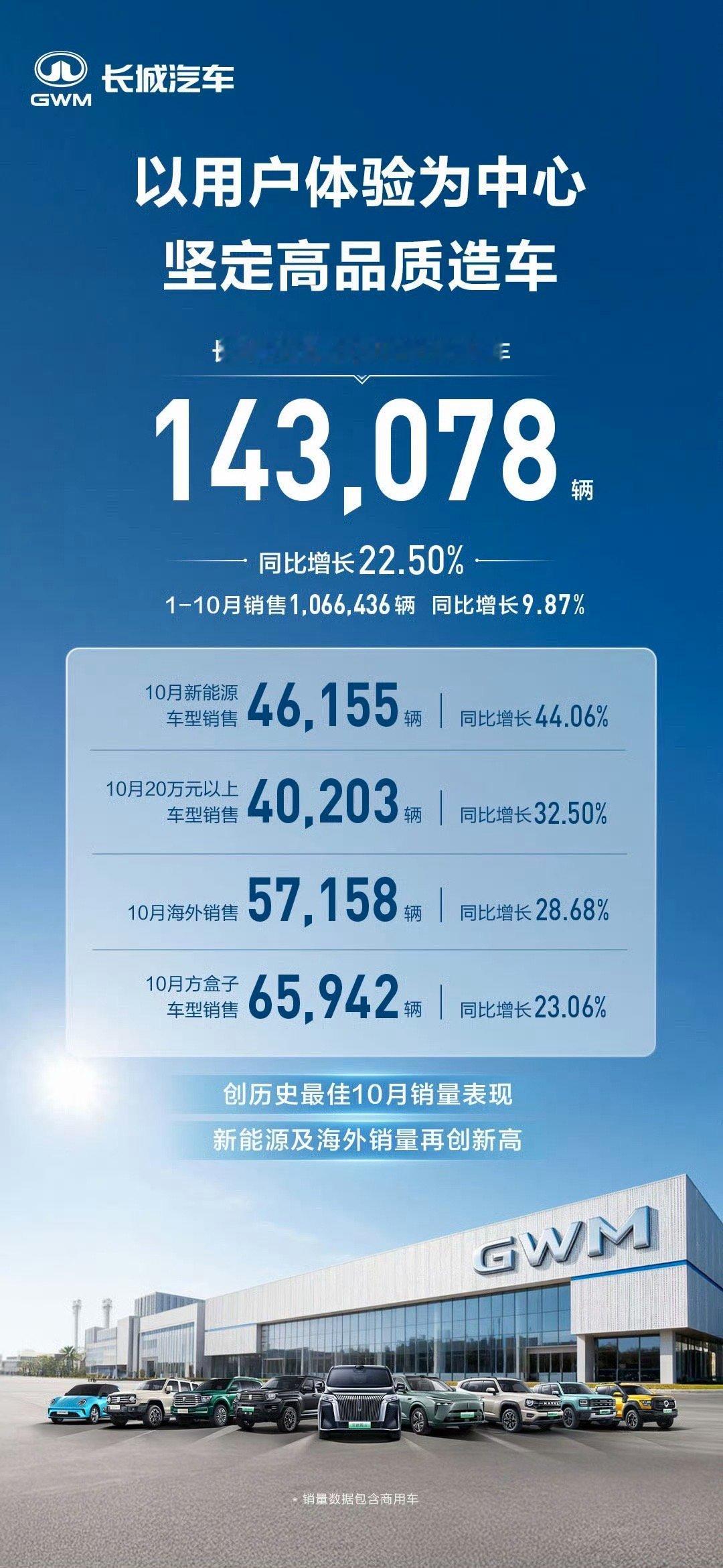 长城汽车10月销售新车14.31万辆,新能源车型销售4.62万辆,长城汽车战报
