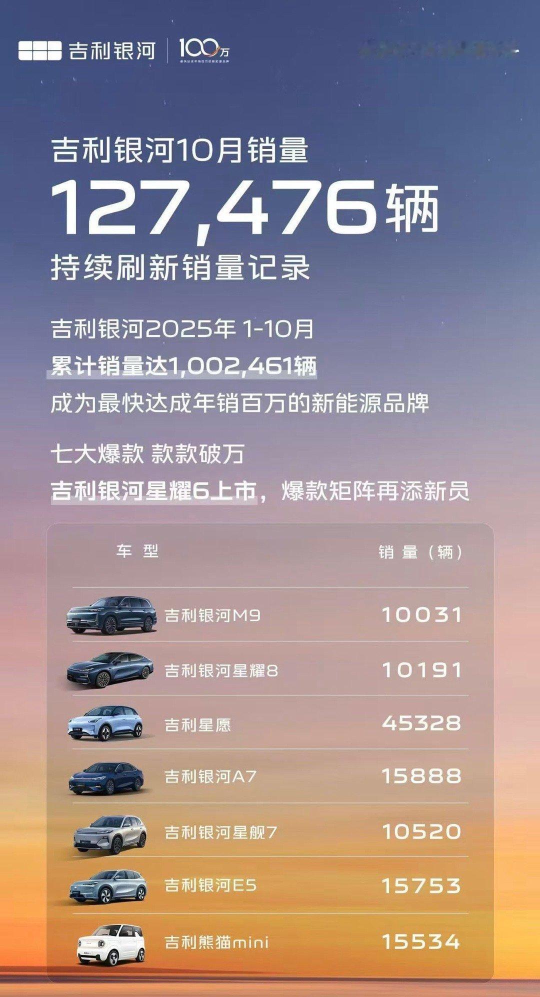 1-10月,累计销量超100万,成为最快达成年销百万的新能源品牌!吉利银河达成年销百万