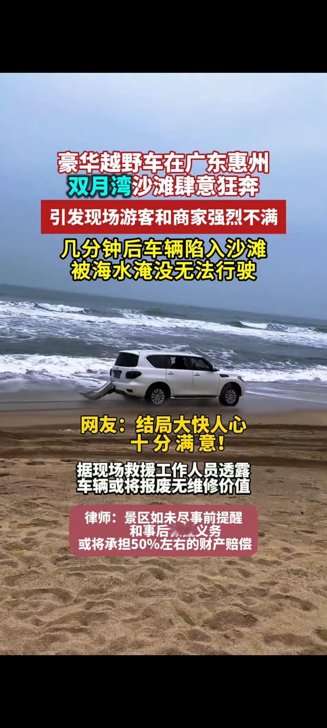 一顿操作猛如虎 在惠州双月湾 一辆途乐越野车,开始冲沙,郑州牌照,看着挺唬人。车主估计是想撒欢,直接开进沙滩了,这操作,有点猛。 开进去没多久,后保险杠掉了,估计是冲沙冲的,掉了就掉了,车主没当回事,继续开,这下好了,直接陷进去了,动不了了,想出来,出不来了,海水开始涨潮,副驾驶车门,车主还得拉着,防止被海浪冲走。 有人拍了视频,记录全过程了,越看越觉得,这车主有点尴尬。 抢眼是抢眼了,陷进去的时候,有多狼狈就多狼狈,总而言之,一句话图啥呢???