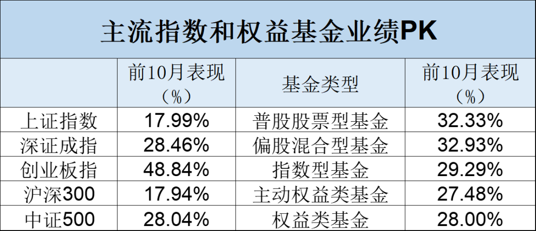 具体来看,主动权益基金前10月整体平均获得27.48%的净值增长率。最低仓位分别为80%和60%的普通股票型基金和偏股混合型基金更能体现整体公募基金的权益投资能力。数据显示,截至10月31日,今年以来普通股票型基金、偏股混合型基金平均单位净值增长率分别为32.93%、32.33%,显然是一个业绩丰收“大年”。