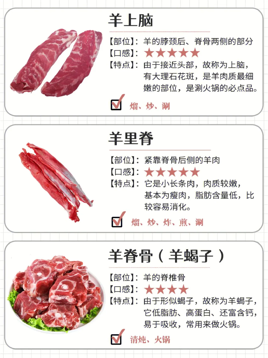 🐏 羊上脑:在羊脖颈后、脊骨两侧,有大理石花斑,是羊肉最细嫩的部位,涮火锅必点!熘、炒也很赞~