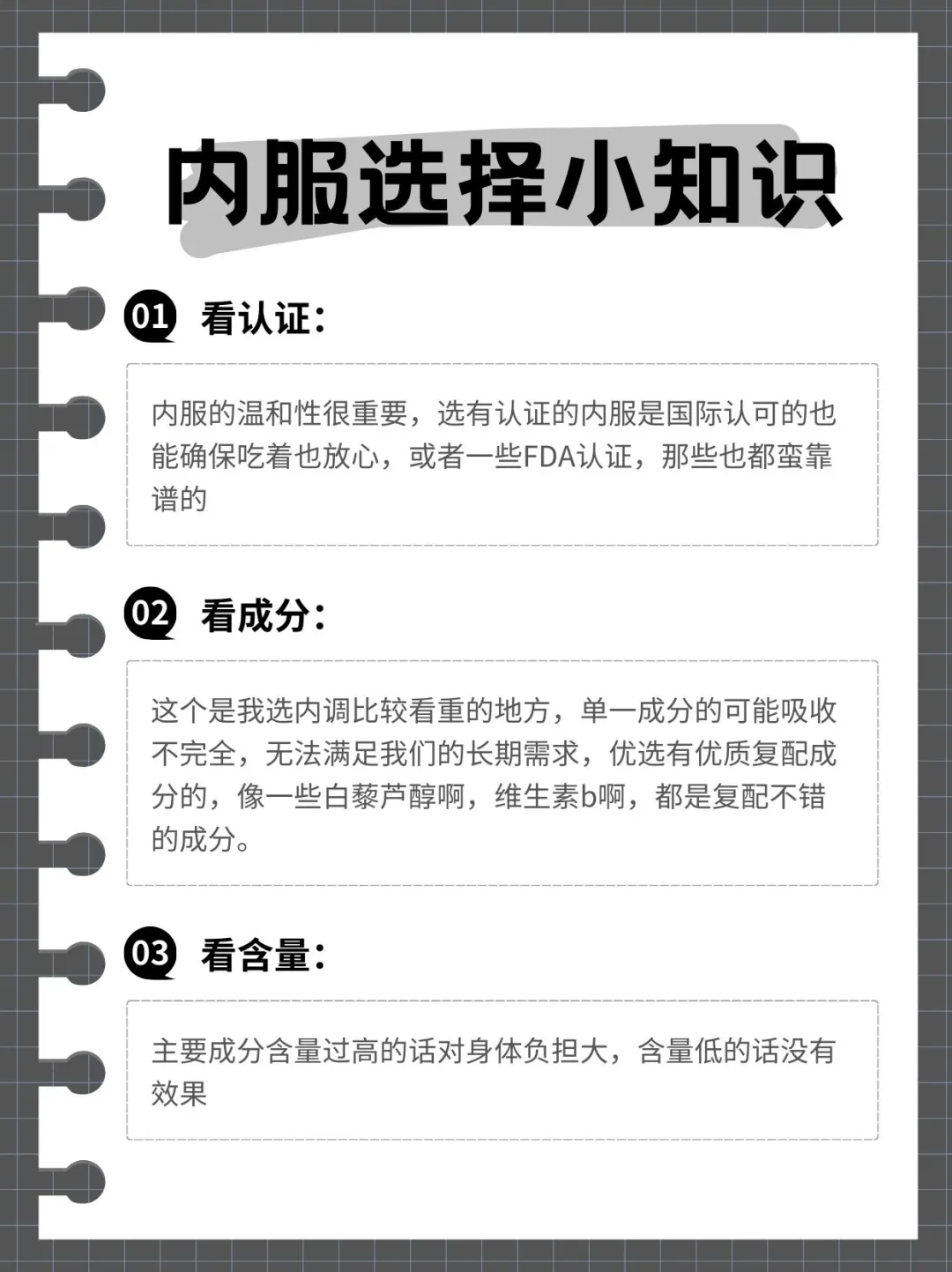 内服的温和性很重要,选有认证的内服是国际认可的也能确保吃着也放心,或者一些FDA认证,那些也都蛮靠谱的