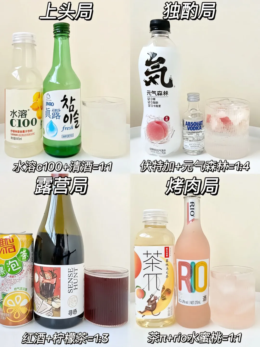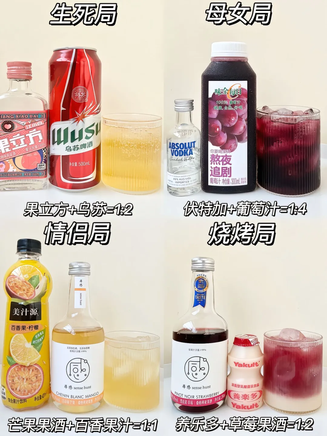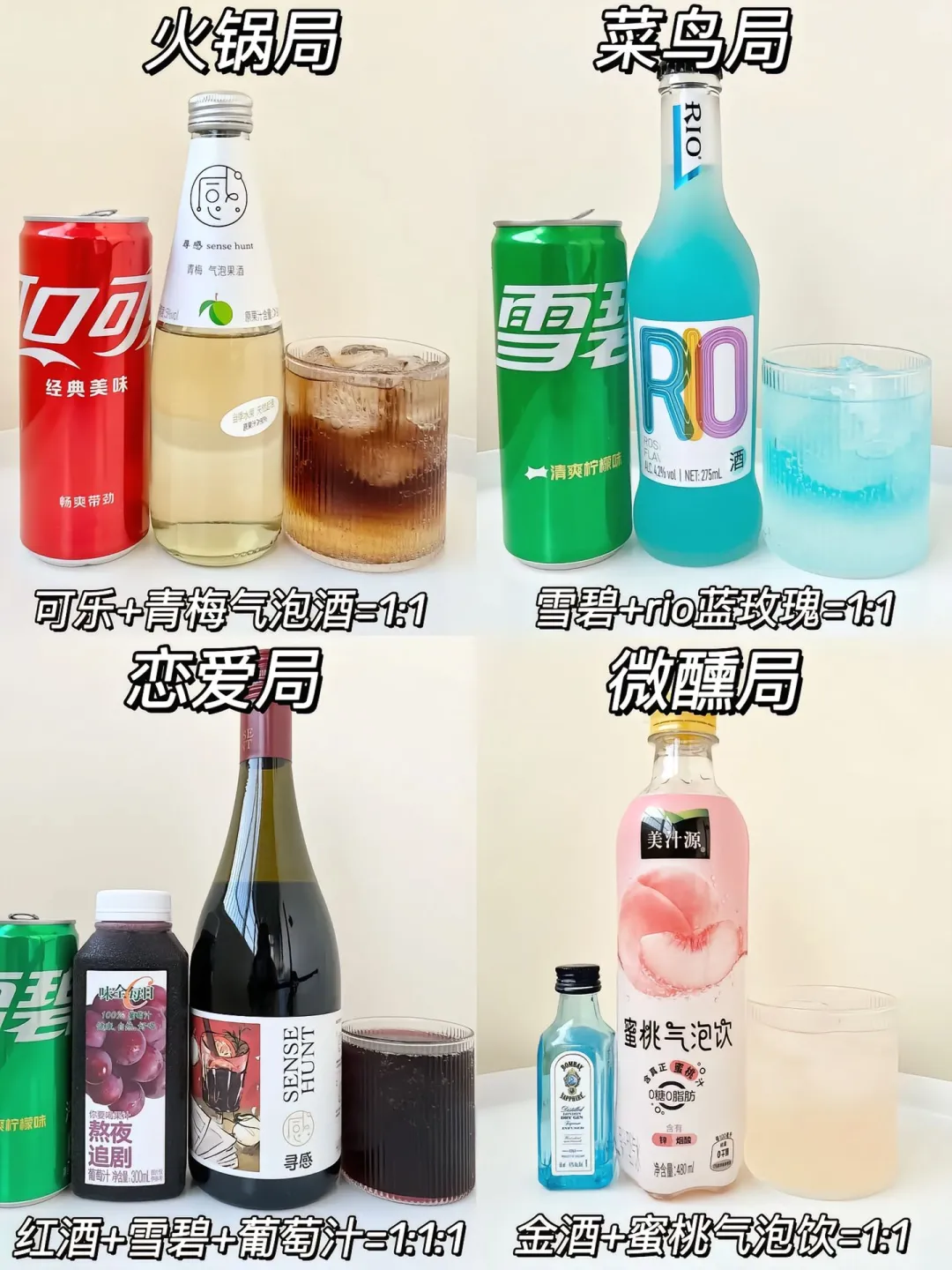 • 恋爱局:红酒+雪碧+葡萄汁,1:1:1。红酒的醇厚与雪碧的气泡、葡萄汁的甜相互碰撞,层次丰富,超适合小情侣营造氛围~
