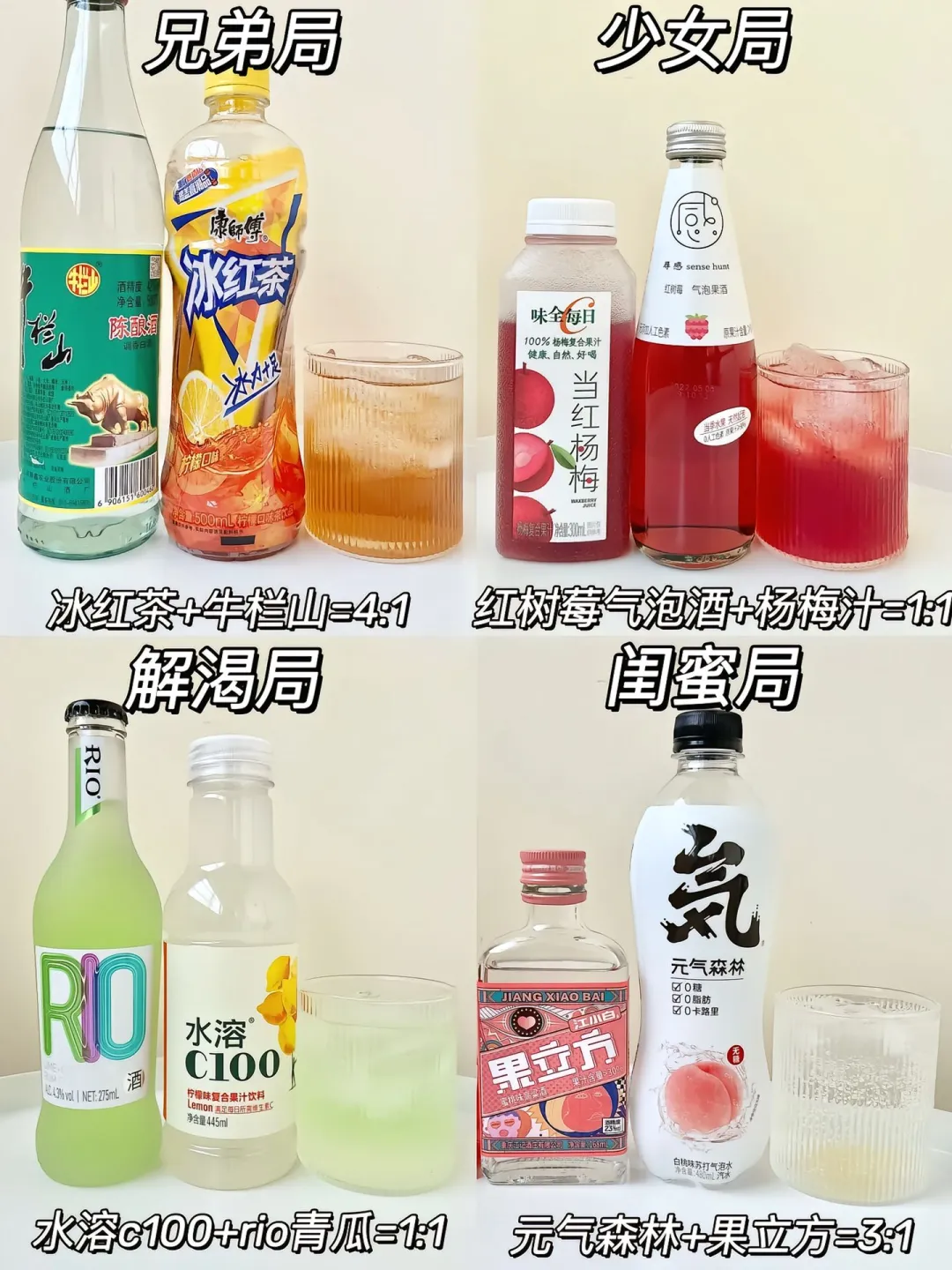 • 兄弟局:冰红茶+牛栏山,比例4:1。清爽的冰红茶中和了牛栏山的烈,入口顺滑,越喝越上头!