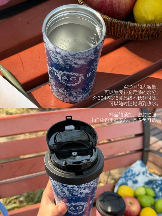 400ml的大容量,可以为我补充足够的水分,外304内316食品级不锈钢材质,可以随时随地喝到热水。杯盖的锁扣,密封性强,出门放包里很安心。且多色可选。