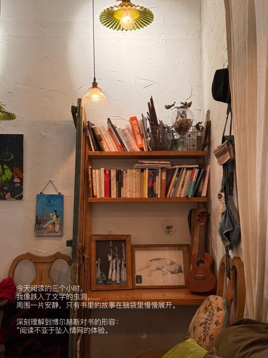 今天阅读的三个小时,我像跌入了文字的虫洞,周围一片安静,只有书里的故事在脑袋里慢慢展开。深刻理解到博尔赫斯所说的:“阅读不亚于坠入情网的体验。”