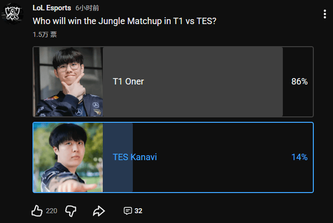 打野:Kanavi获得14%的票数;Oner获得86%的票数。