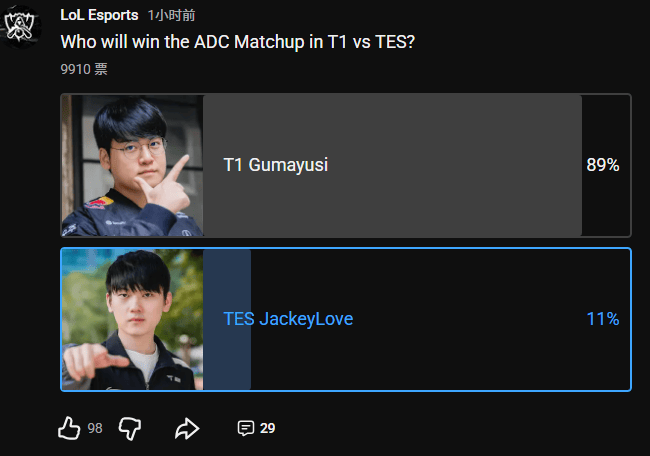 AD:JackeyLove得票占比11%;Gumayusi得票占比89%。