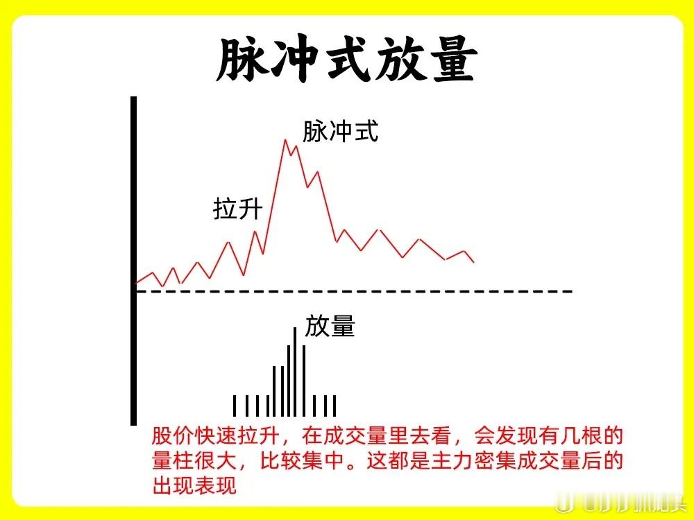 股价在低位,在分时图里,股价走势比较平稳,突然时不时出现放量冲击波,股价快速拉升,在成交量里去看,会发现有几根的量柱很大,比较集中。这都是主力密集成交量后的出现表现,所以往往主力在这种脉冲式上的时候,就会出现阶段性的放量