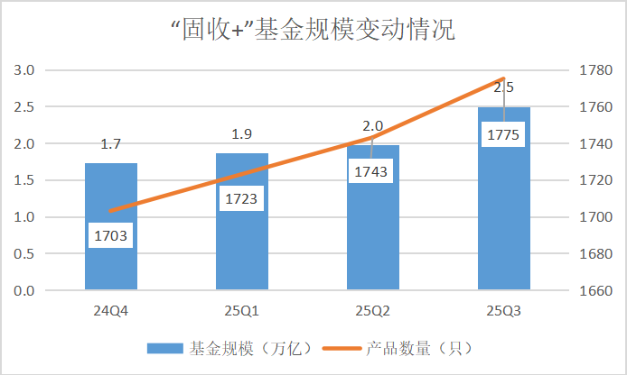 截至9月30日,“固收+”(包含混合债券型一级债基、混合债券型二级债基、偏债混合型基金、和可转债基金)规模达到了2.5万亿,相较于去年底增长7700多亿,产品数量也不断攀升,达到1775只(仅包含初始基金)。