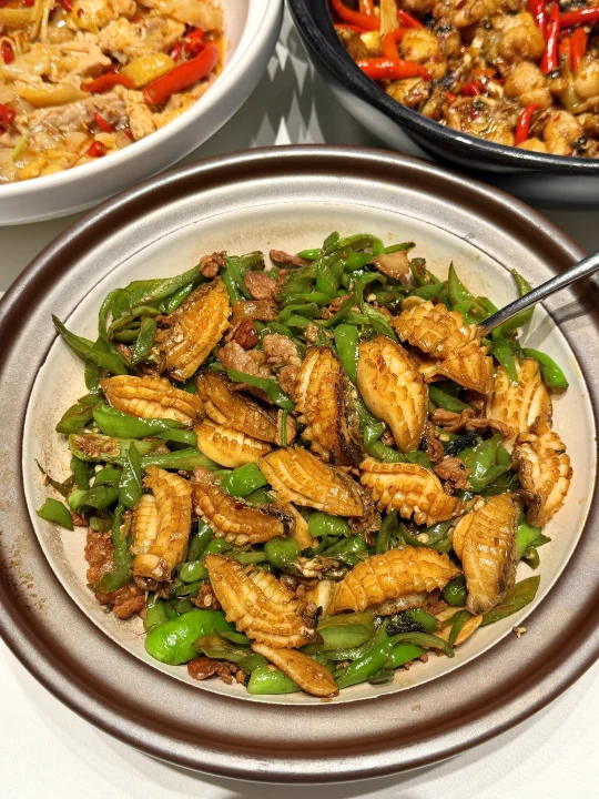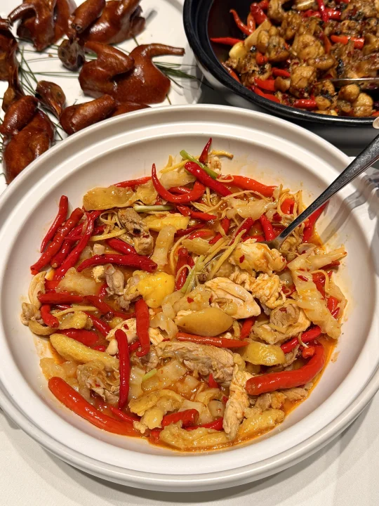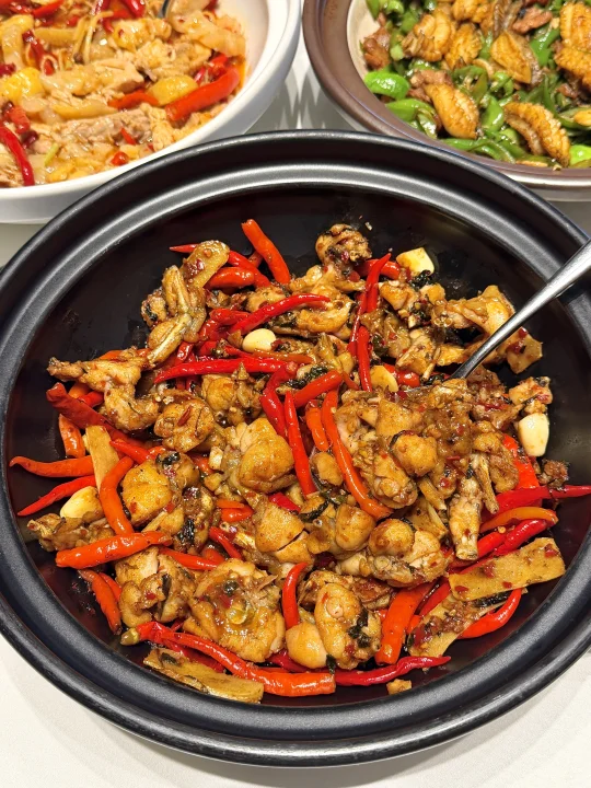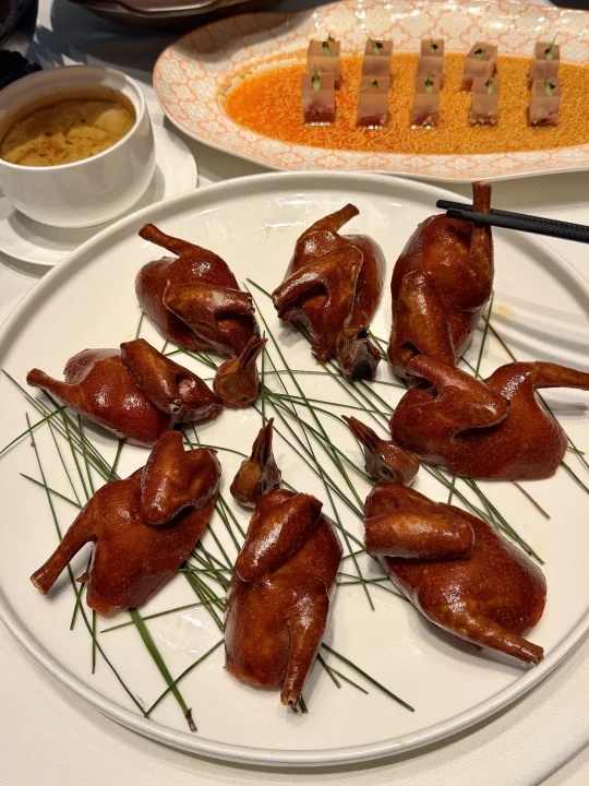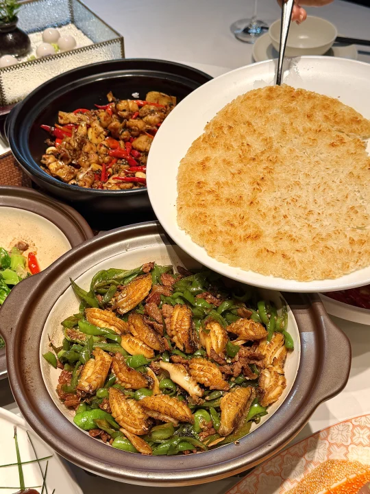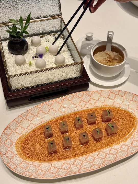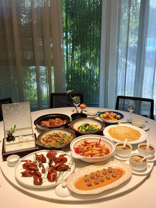 真没想到菜品会这么好看!直到我们吃完!有被惊讶到!居然湘菜、甜品都没有踩雷~ 有机鲜辣椒鲍鱼拌饭很入味~吃的出鲍鱼品质好好!!口味牛蛙好嫩好下饭!香香辣辣靠着它🥹我可以狂炫三碗米饭!还有珍珠鹅肝、水晶肴肉、烤乳鸽都好好吃 包厢环境也是新中式风~很有氛围!不管是宴请还是朋友聚会都是不错的选择!定位到📍潇湘里