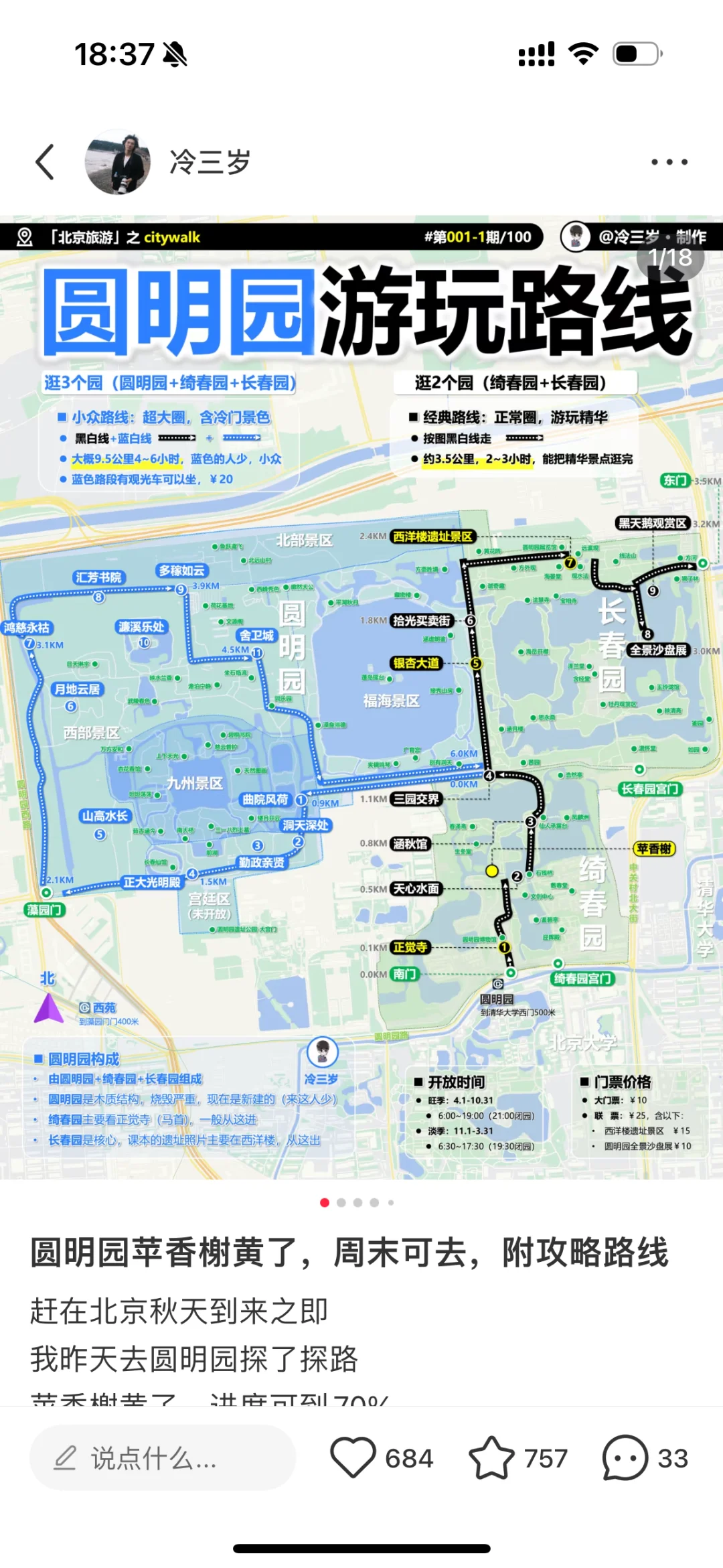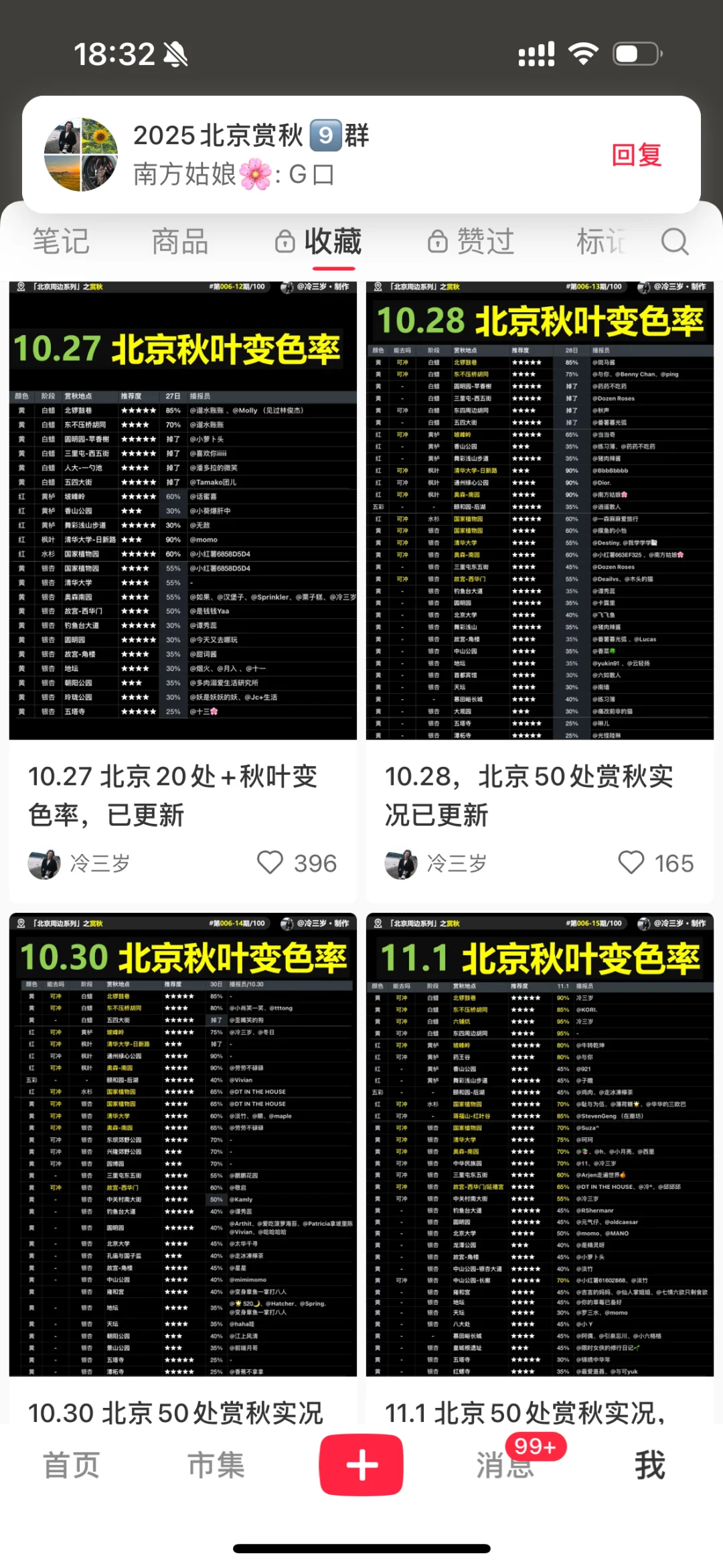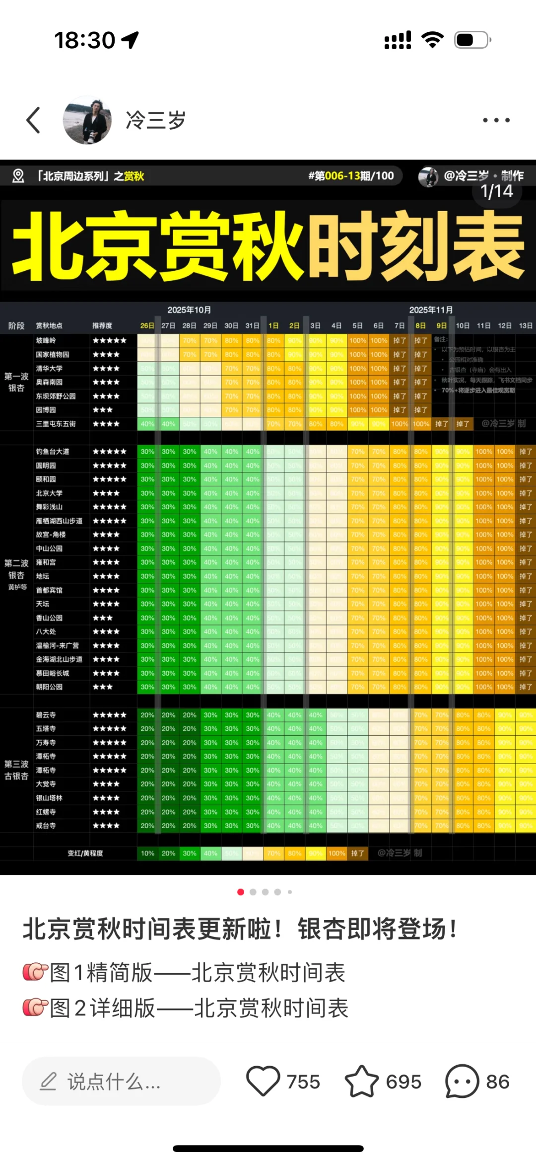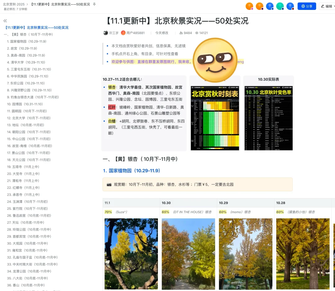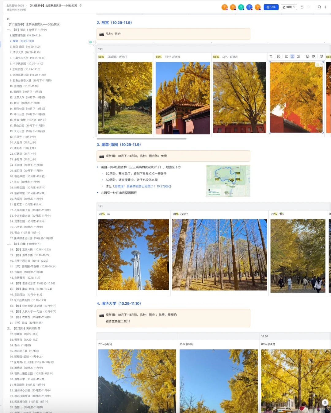 北京最近3天天气超好 已经有一些地方的银杏已经黄透 还有些微黄,但也可以观赏了 也很好出片 说了好几天的路线图 终于画完了 其中: [打卡R]标黄的是已经黄了,最近一周是最佳观赏期 橙色的是微黄,配色黄字的,是最近也可以去 (:这类,不只是银杏,所以天气好,啥时候去都可以 (:像钓鱼台银杏大道,这种只有银杏,一定要等银杏黄透,这类建议下周后半周或周末才进入最佳观赏期。 [打卡R]绿色的是微微黄,至少等一周,一般是大的,或古银杏,寺庙里常见 [拔草R][拔草R][拔草R]其中有4条赏秋路线 最近几天只需要考虑AB两条就行 [种草R]A路线:大部分是打卡点,大概半小时可逛完 (奥森、地坛、中山公园,也可以玩小半天,其中奥森比较大,我之前能逛一天) [种草R]B路线:基本都是大景点,除了清华大学,大部分能逛半天;一天最多安排两个,别太多了 如果想知道各个地方都是啥样的景色,黄叶进度如何了 群会每天同步(类似图2~3) 群置顶也有文档,里面每天会更新北京50+个地方的秋景实况照片,是根据群里各位朋友分享,以及我自己踩点整理进去的。(图4~5) [种草R]CD两条路线,可以等3天到一周,还没黄透 其中五塔寺、天坛,如果本身想逛,也可以随时去 此外 [向右R]郊区版,寺庙版的赏秋地图我之前也做过,图6~7,供参考 [向右R]图8是北京各地赏秋时刻表 [向右R]图9-14是北京比较大的景点具体游玩路线,比如雁栖湖,颐和园,圆明园,清华大学,奥森等 (以后的退休生活就经常出门转转,写写攻略。北漂10年也没好好玩玩北京,最近3个月应该会把值得去的都逛逛,也分享攻略出来)