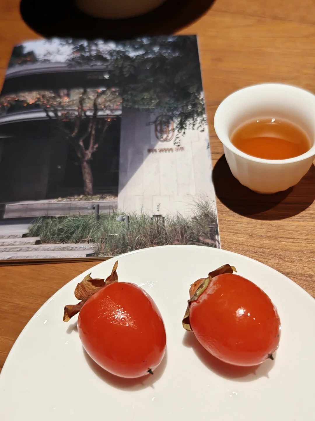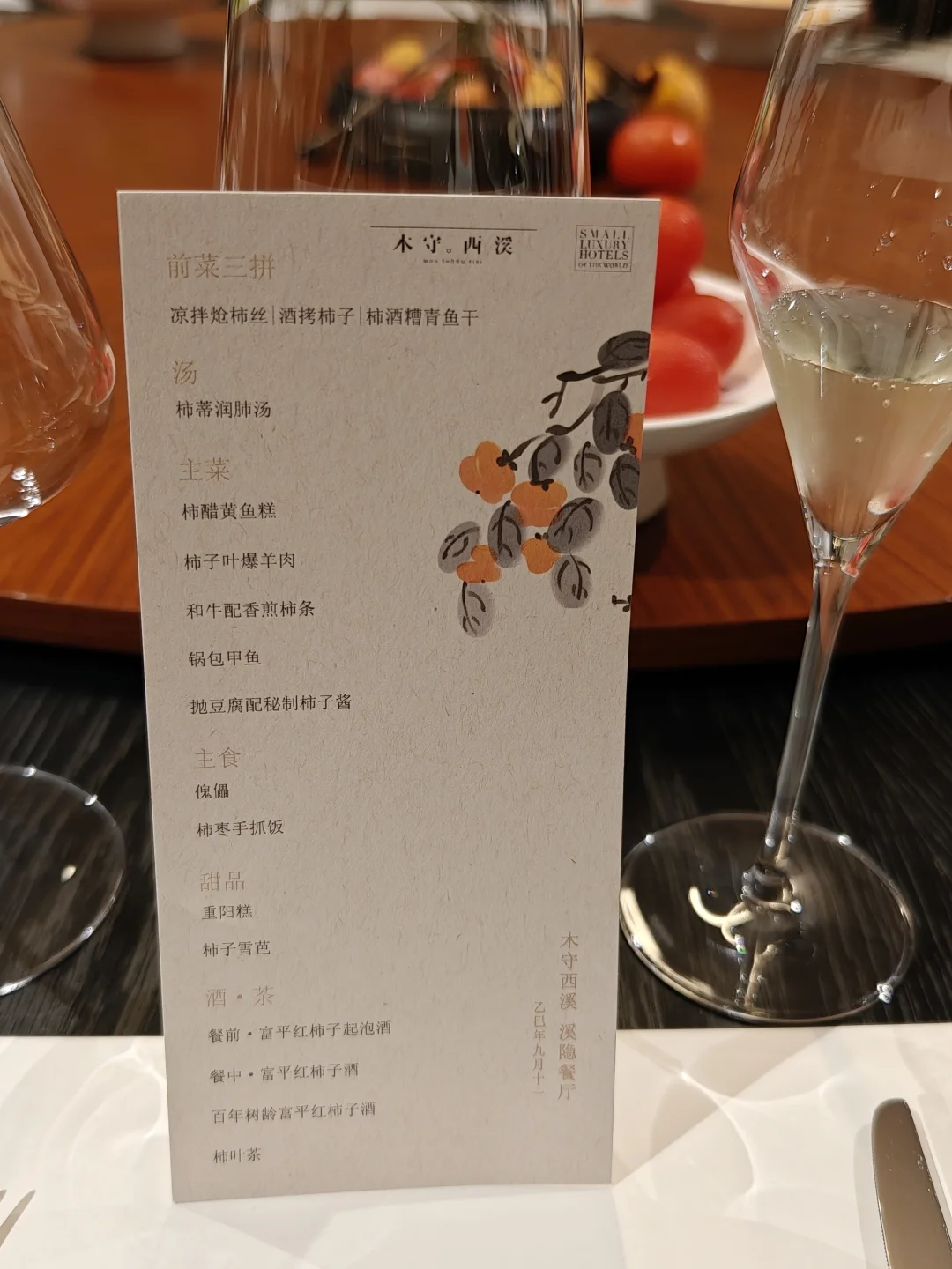 主厨濮师傅以“方圆五公里”的在地风物为魂,将柿的枝、叶、果、蒂化作盘中珍馐——从果肉的清甜到枝叶的清香,从柿醋的鲜醇到柿酱的温润,每一味皆是西溪物候的细腻注解。