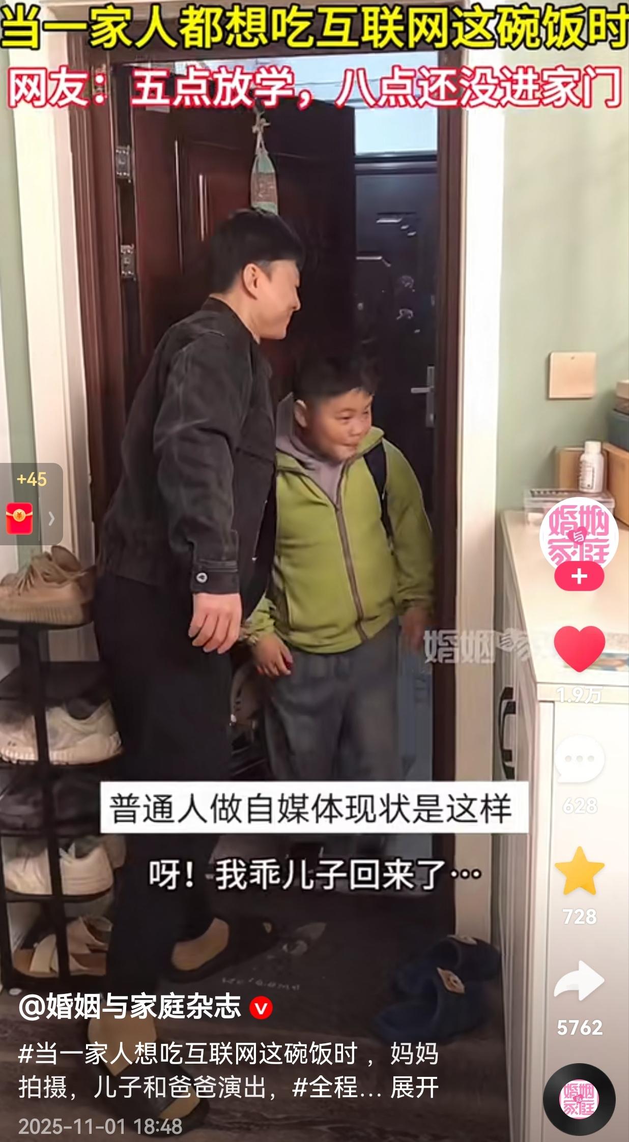 笑不活了!女子看人家通过自媒体赚了很多钱,因此,就把这件事情告诉了老公和儿子,老公和孩子对女子的想法表示支持,也愿意配合。 这天周末,女子拉着老公和孩子就开始拍摄视频。 视频的内容讲的是儿子放学,父母热情招待孩子的情形。 父亲为儿子贴心开门,母亲则主动询问孩子累不累,主打给孩子提供情绪价值,让孩子更加快乐地学习。 结果,剧情都安排妥当了,父子俩一直出幺蛾子,只要女子主动关心孩子,不是丈夫哄堂大笑,就是孩子忍不住大笑,这种笑容根本控制不住。 网友看到后评论说,第一次拍视频没有经验,就会整出幺蛾子,可以理解,拍着拍着就好了! 还有的网友调侃说,本来孩子五点放学,五点半都到家了,结果整这么一出,孩子八点还没有进家门。这不是坑娃吗? 还有的网友说,上学累不累我倒不知道,反正进门真累,这门真不好进。 想做自媒体可以呀!但是,要找到一个合适的赛道,如果自己不擅长这种类型,很容易笑场,那就换一个赛道。毕竟,在一个不合适的赛道,真的很累人! 大家觉得呢?欢迎大家评论区讨论留言。