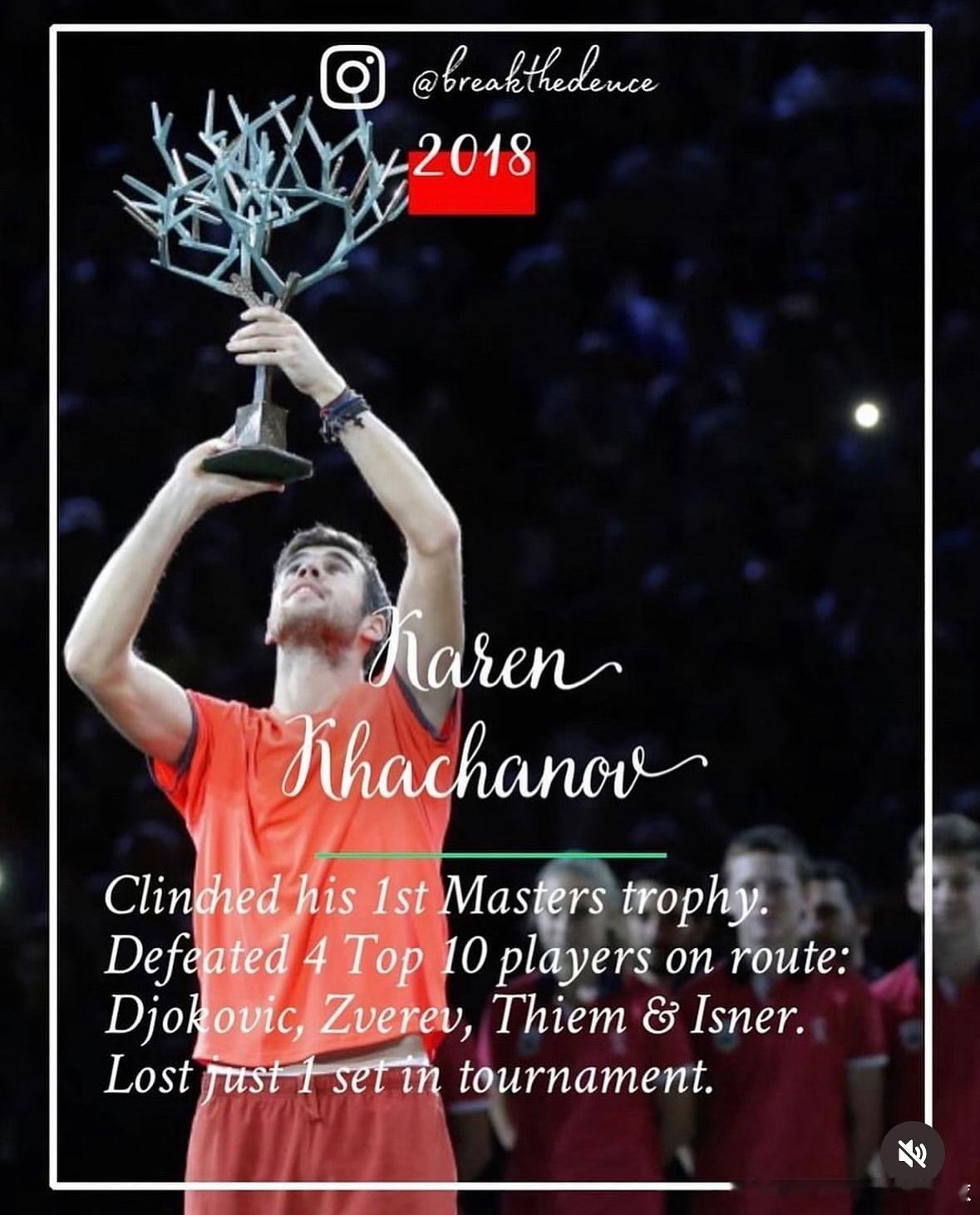 2018年的卡恰诺夫🇷🇺:击败四位前10(德约科维奇,兹维列夫,蒂姆,伊斯内尔),整个赛事只丢一盘;