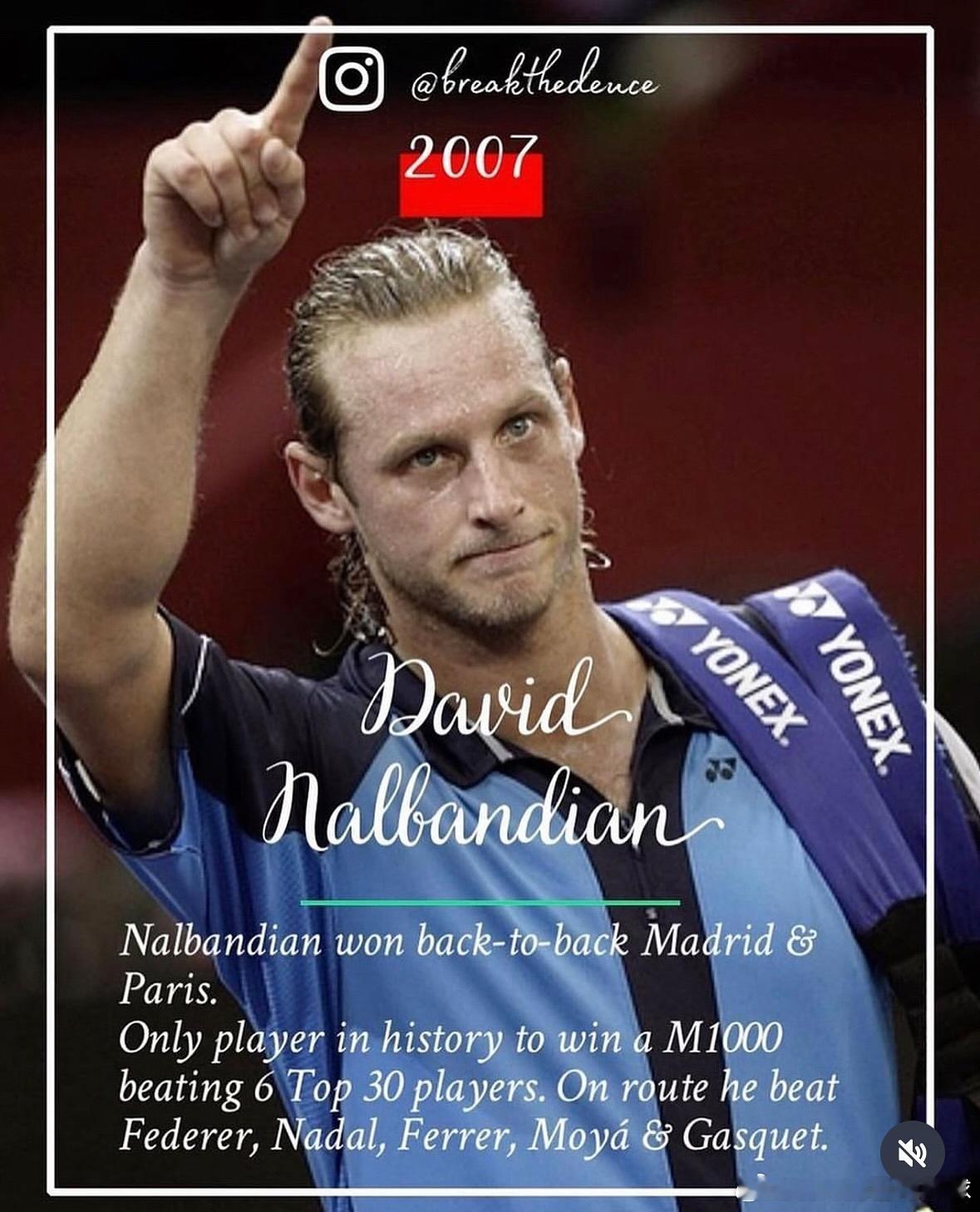 2007年的纳尔班迪安🇦🇷:历史上唯一一个一届大师赛击败6位世界前30,一路上他击败了费德勒,纳达尔,费雷尔,莫亚,加斯奎特;