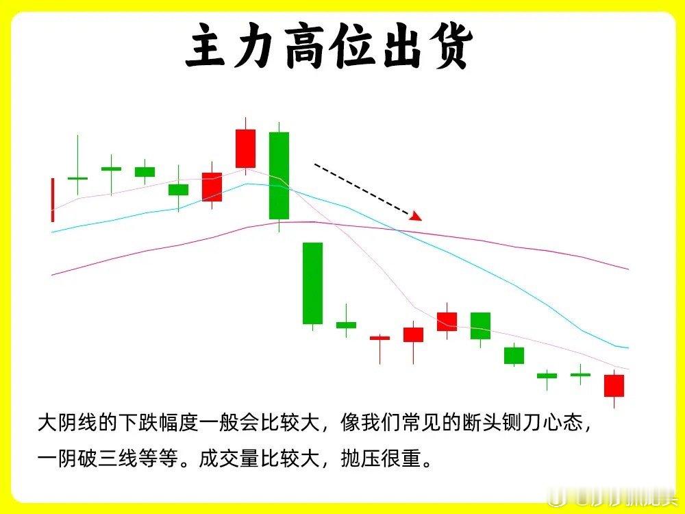 而主力出货,往往会出现成交量明显放大,股价却没有上涨,说明上涨动力明显不足,成交量越大,此时的分歧就比较大。而且大阴线的下跌幅度一般会比较大,像我们常见的断头铡刀形态,一阴破三线等等。成交量比较大,抛压很重。这次成交量的不同之处