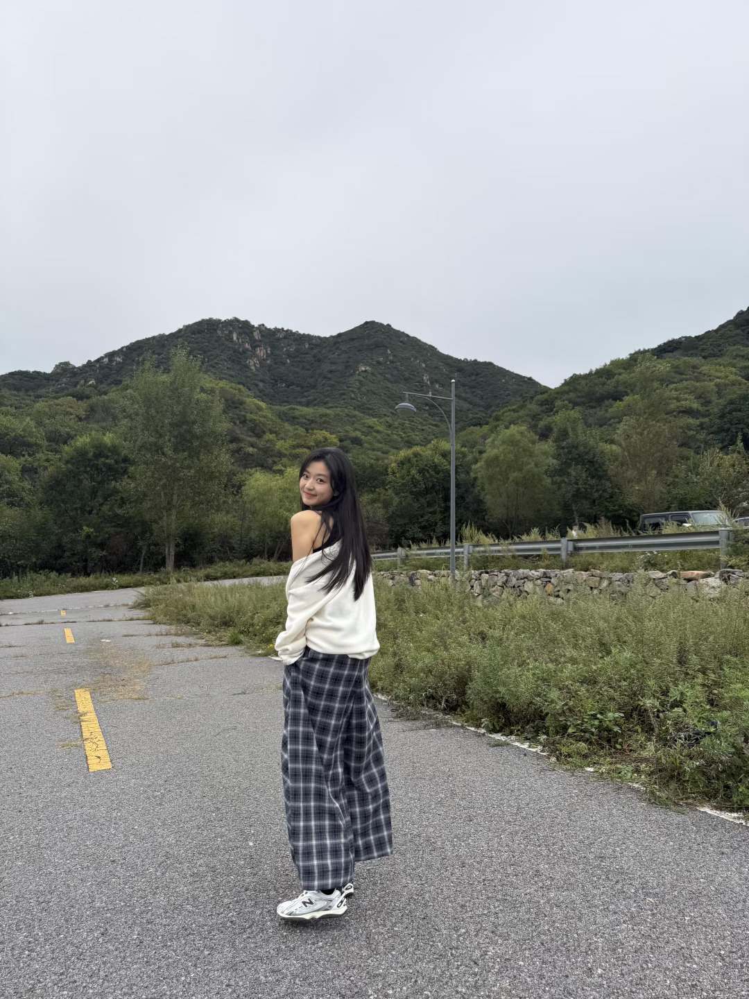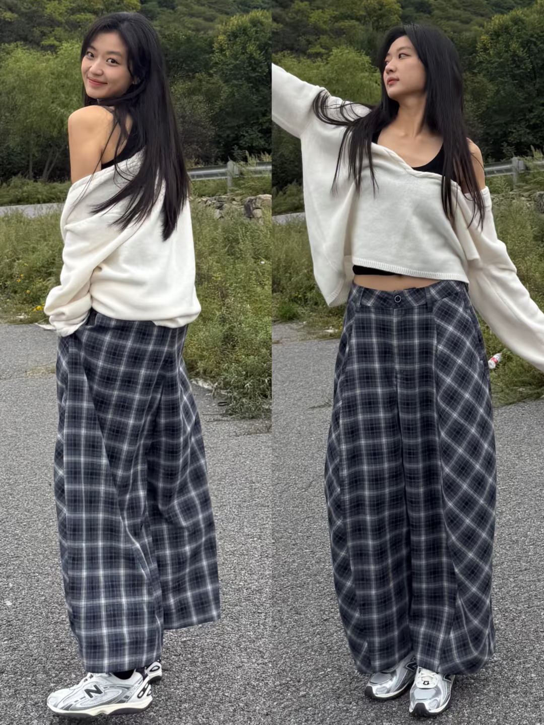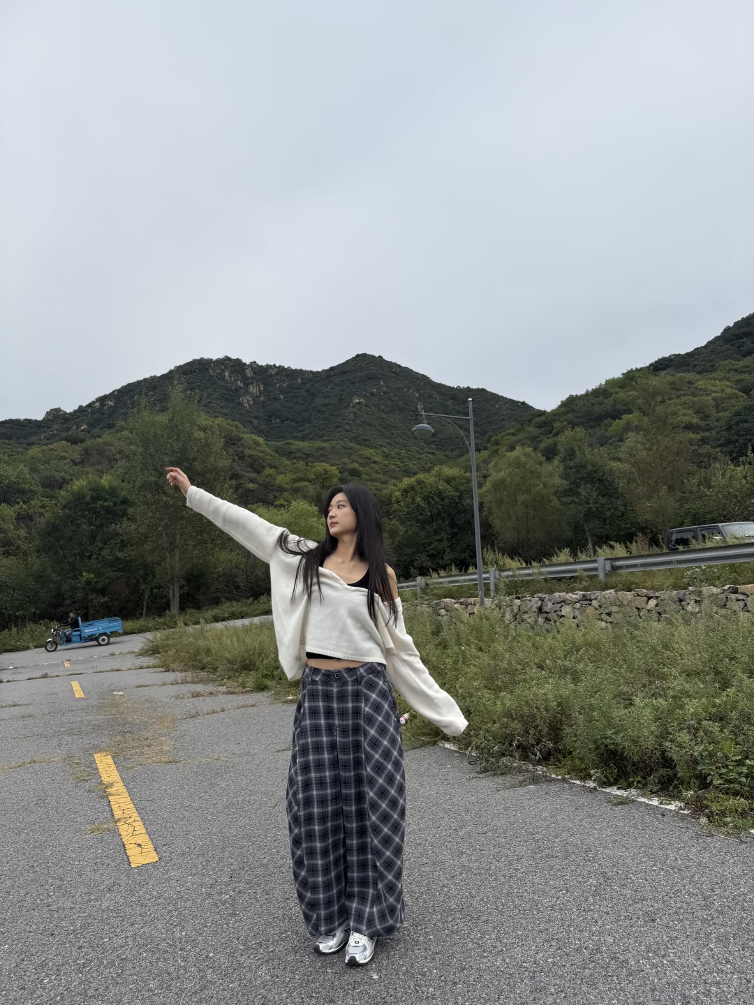 要不说孙千是公认的时髦精呢!高挑的身材就是行走的衣架子!最近入秋穿搭又美出新高度👏 米白色大V领针织衫,随性地半搭在肩头,露出内搭的黑色小背心,性感与慵懒感一键切换,针织的柔软质感还自带温柔滤镜~格纹阔腿裤复古又高级,宽大的裤型把“松弛感”拉满,显瘦又时髦谁能不爱!