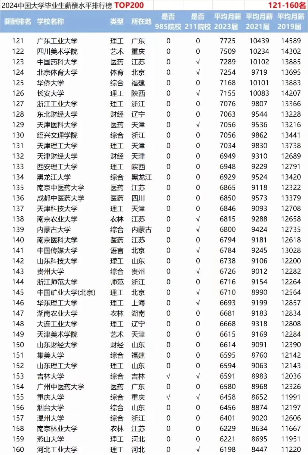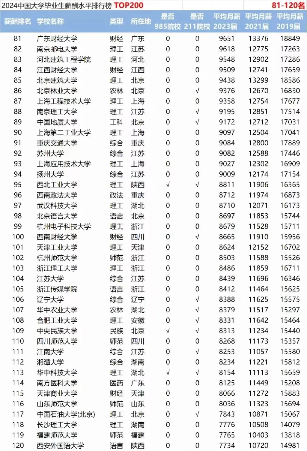 📌从平均薪酬来看:毕业生平均月薪能超过11000元的高校有50所(较2023年增加33所);毕业生平均月薪超过10000元的院校有73所(较2023年增加23所)。毕业生平均月薪最高为清华大学13221元,毕业生平均月薪第100名为西南财经大学8665元;第200名为河南科技大学,月薪4763元。