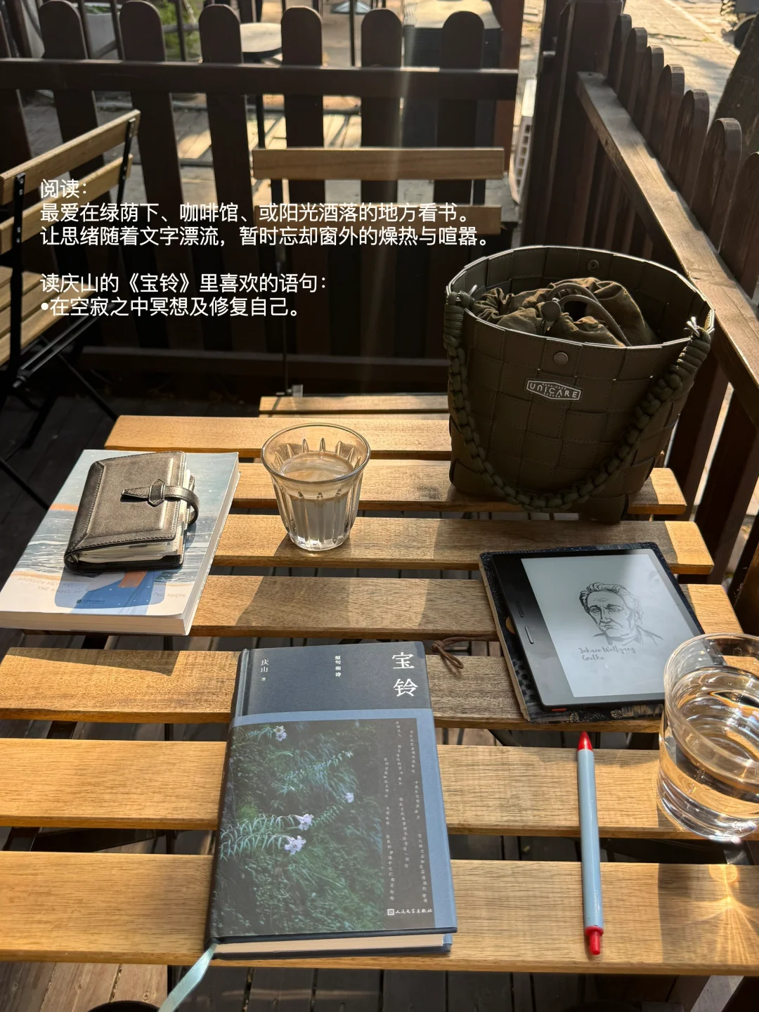 最爱在绿荫下、咖啡馆、或阳光洒落的地方看书。