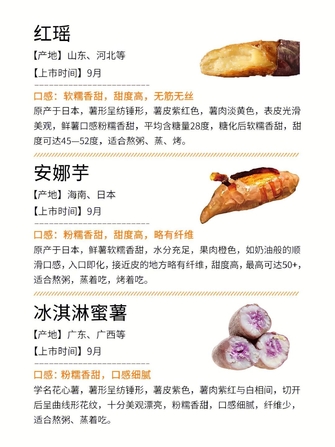 • 冰淇淋蜜薯:广东、广西9月上线,薯肉紫白相间像冰淇淋🍨 粉糯香甜纤维少,切开花纹美到舍不得吃~