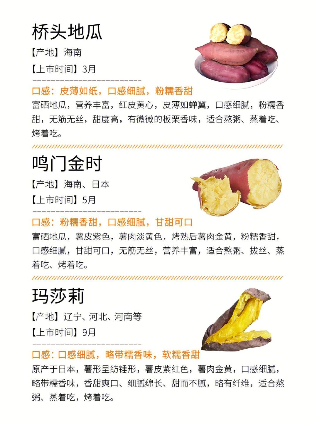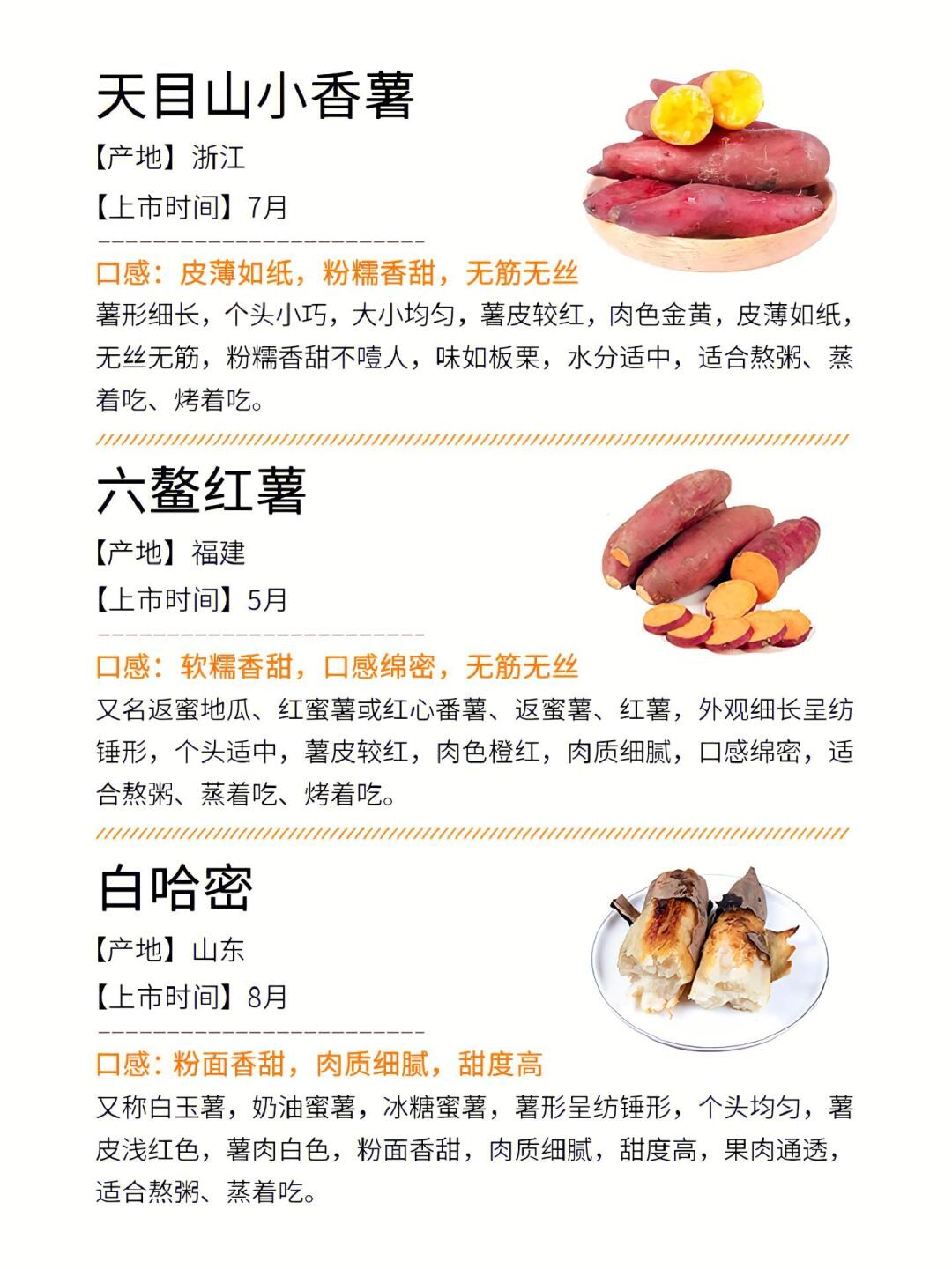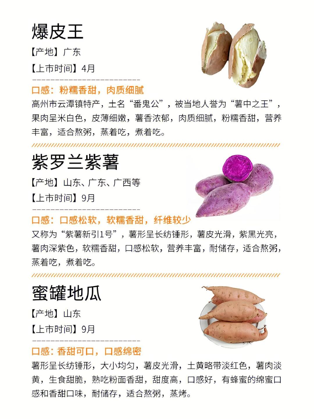爱吃地瓜的宝子看过来!整理了超全的地瓜品种攻略,从甜糯到粉面,不同口感一网打尽,还有上市时间,再也不愁买不到心仪地瓜啦✨