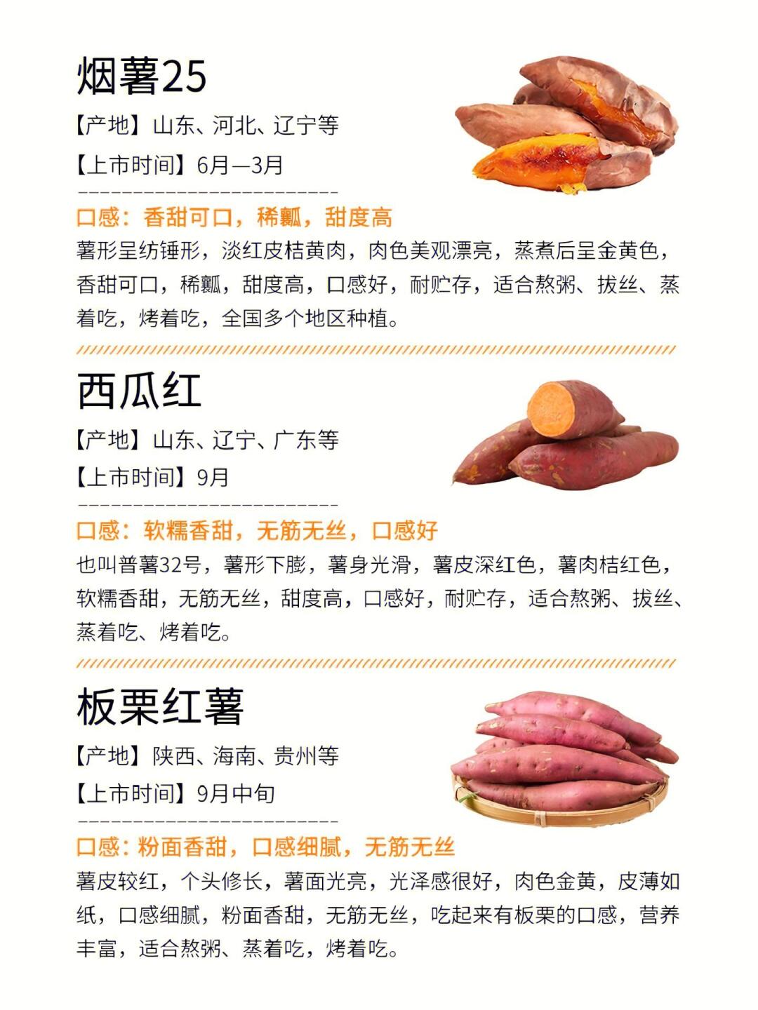 • 烟薯25:山东、河北等地的宝藏!6月 - 3月都能炫,烤着吃直接流蜜💦 香甜稀瓤,熬粥、拔丝也绝,妥妥地瓜界甜妹~