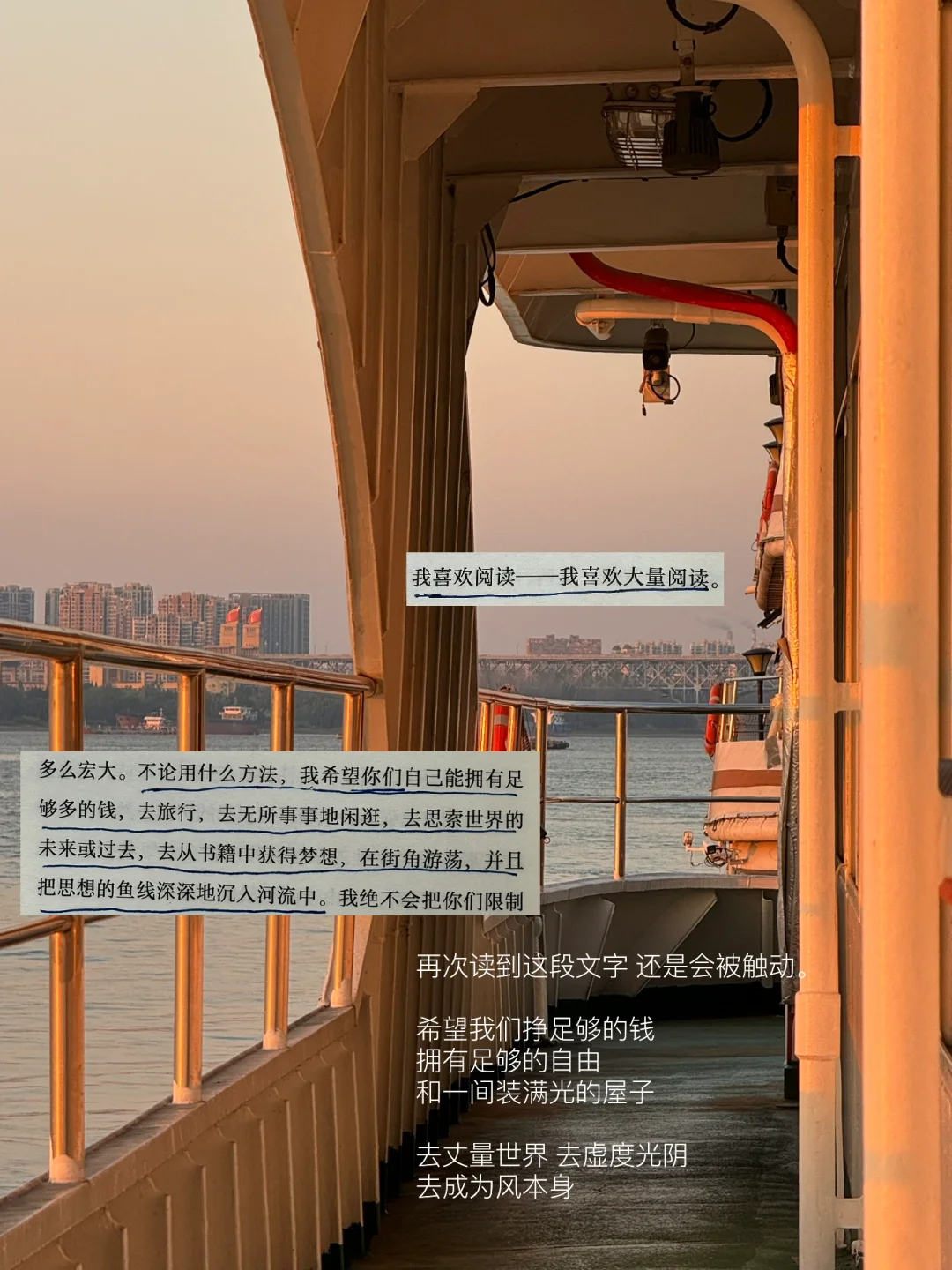 “不论用什么方法,我希望你们自己能拥有足够多的钱,去旅行,去无所事事地闲逛,去思索世界的未来或过去,去从书籍中获得梦想,在街角游荡,并且把思想的鱼线深深地沉入河流中。”