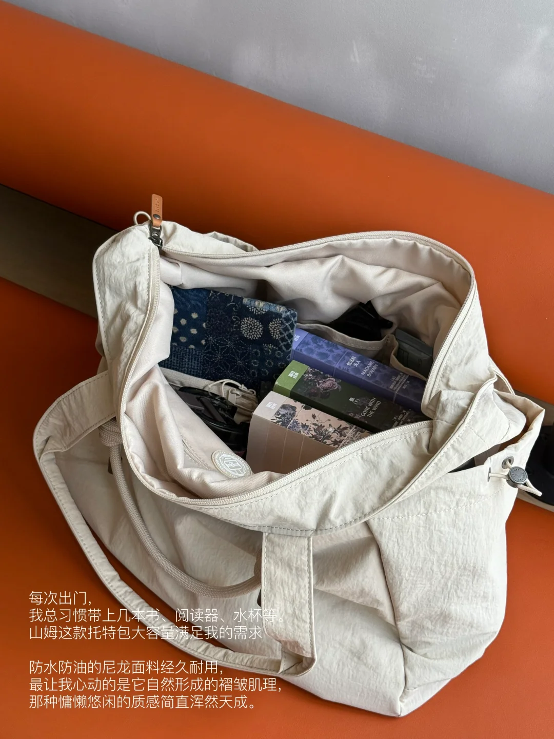 每次出门,我总习惯带上几本书和阅读器、水杯等。山姆这款托特包完全能满足我的需求,防水防油的尼龙面料经久耐用,最让我心动的是它自然形成的褶皱肌理,那种慵懒悠闲的质感简直浑然天成。