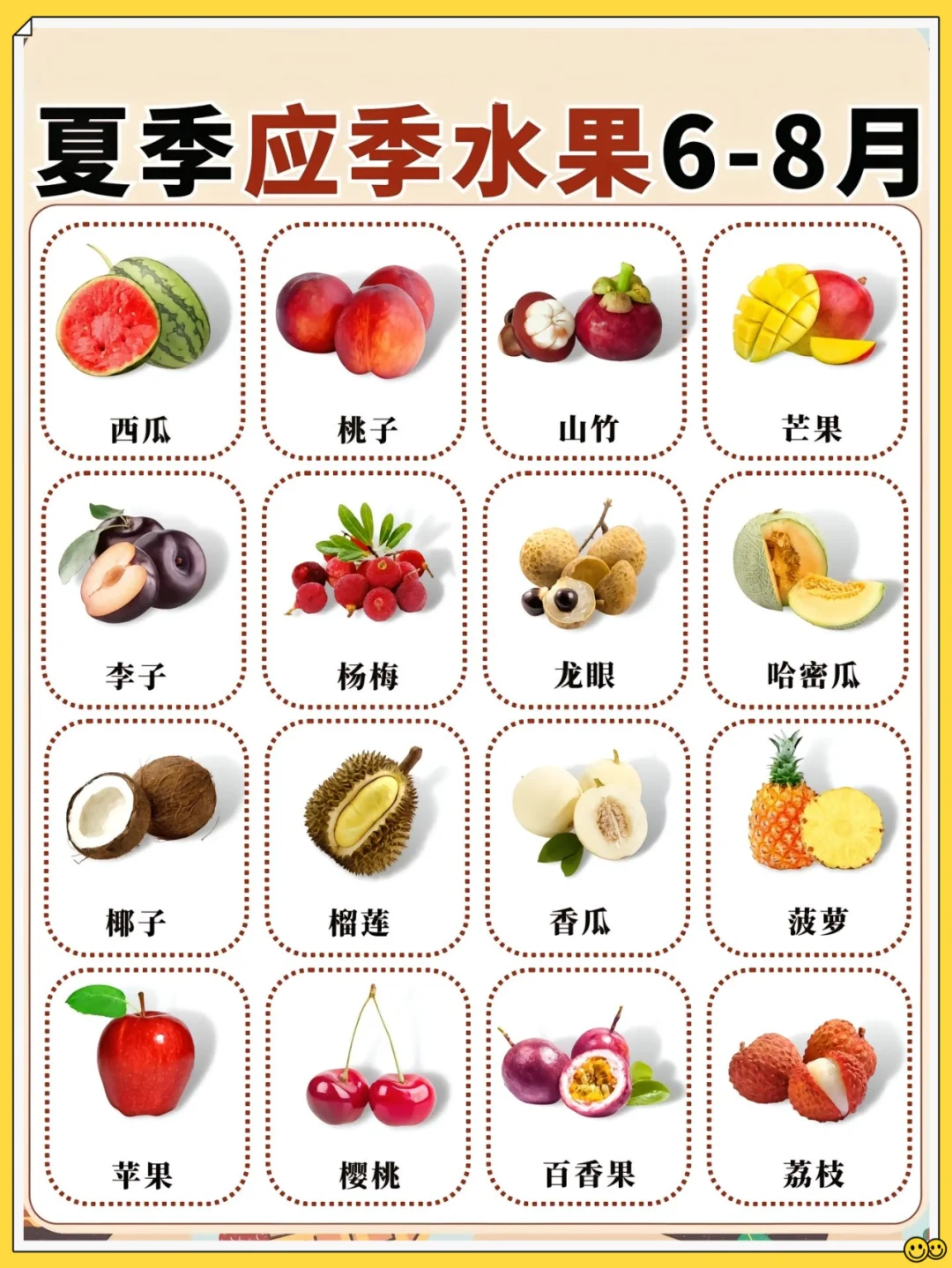🍉 西瓜、油桃、山竹、芒果、李子、杨梅、龙眼、哈密瓜、椰子、榴莲、香瓜、菠萝、苹果、樱桃、百香果、荔枝