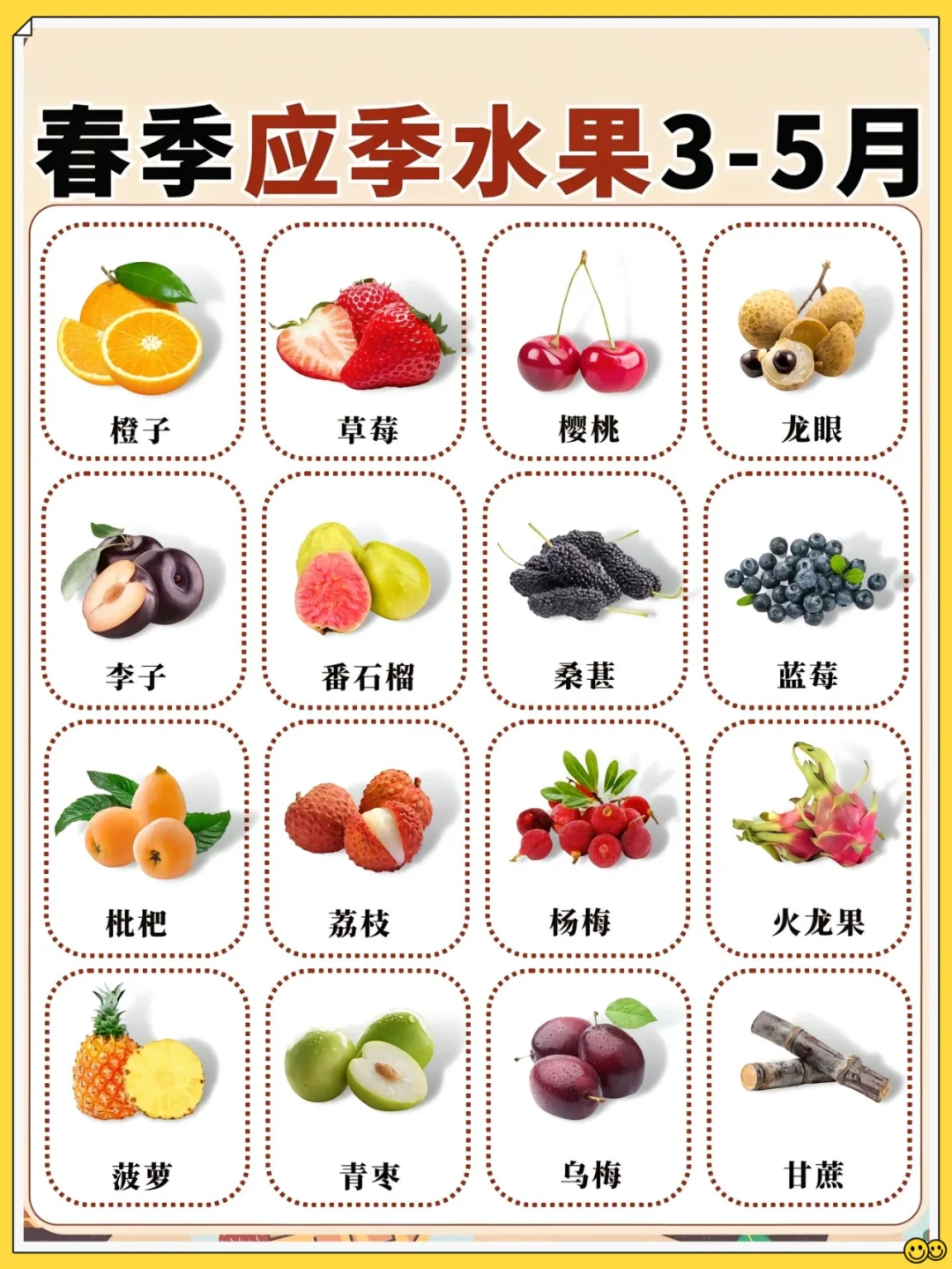 🍊 橙子、🍓 草莓、🍒 樱桃、龙眼、李子、番石榴、桑葚、蓝莓、枇杷、荔枝、杨梅、火龙果、菠萝、青枣、乌梅、甘蔗