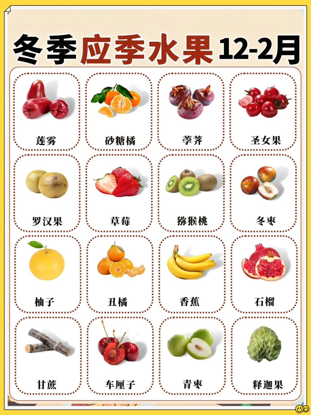 🍓 草莓、🍊 橙子、柚子、莲雾、圣女果、罗汉果、猕猴桃、冬枣、丑橘、香蕉、石榴、甘蔗、车厘子、青枣、释迦果