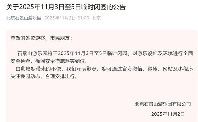 公告称,石景山游乐园将于11月3日至5日临时闭园,对游乐设施及环境进行全面安全检查,确保安全措施落实到位。