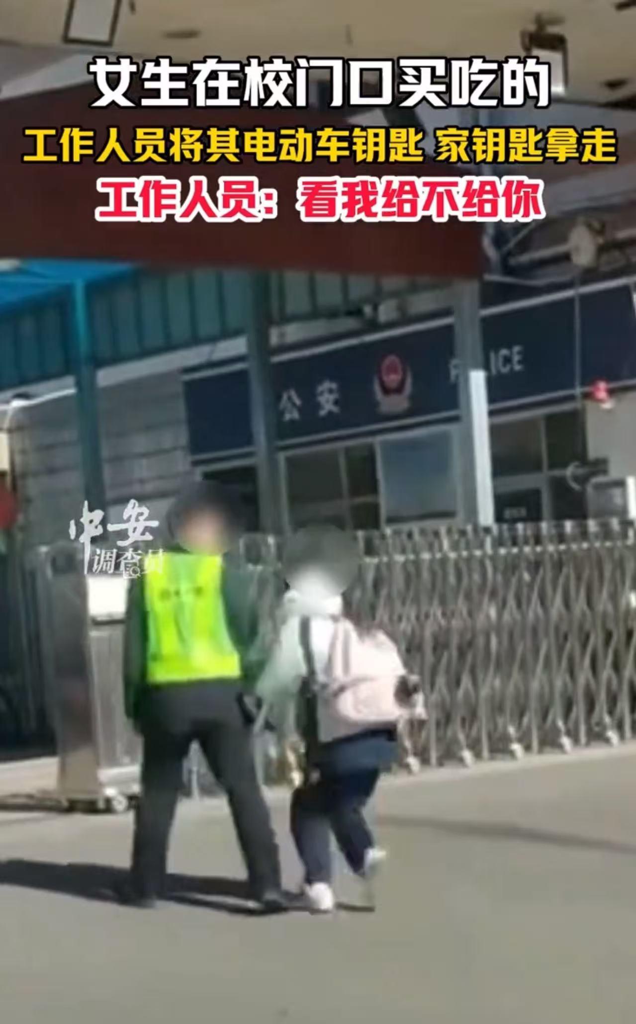 “好大的官威啊!”山西大同,女生在校门口买吃的,工作人员将其电动车钥匙拿走!女生哭着求工作人员还给自己,工作人员却说:“看我给不给你……”网友:学校的工作人员,有抢夺学生财物的权力了吗?   一名女生因饥饿购买了路边摊贩的淀粉肠,没等享用就遭遇了意想不到的对待。   一名身着绿色背心与马甲的男性学校工作人员,未做任何沟通便径直上前,夺走了女生手中的电动车钥匙与家门钥匙。   女生瞬间陷入慌乱,紧随工作人员身后不断追赶,情急之下大声哭喊“还给我”,几次伸手试图夺回属于自己的物品,急得直跳脚。   但工作人员始终不为所动,反而语气强硬地抛下一句“看我给不给你”,径直走向校内。   最终,女生追进学校后,经工作人员一番批评,才得以拿回自己的钥匙。   这一幕被路过市民用手机记录下来,上传网络后迅速掀起热议。   事件发酵后,大同四中相关领导很快作出回应。   校方表示,学校的相关行为属于正常管理范畴,核心考量是校外流动摊贩的食品质量缺乏保障,可能对学生身体健康造成隐患。   同时校方提到,网络传播的视频存在夸大成分,并非事件全貌。   目前学校已向上级部门汇报情况,并成立专项工作专班展开调查,后续将依据调查结果依法依规处理,且会尽快向社会公布调查进展。   部分家长对学校的管理初衷表示理解,他们自身也不希望孩子食用来源不明的零食,认可学校对学生饮食安全的管控。   但更多网友表达了强烈不满,认为学校工作人员的行为已超出合理管理边界。   电动车钥匙与家门钥匙均属学生私人财产,受法律保护,学校及工作人员并无执法权,无权强行扣押,这种行为涉嫌侵犯他人财产权。   还有部分中立声音指出,校外摊贩食品确实可能存在安全问题,学生需要适当引导,但扣押钥匙的方式过于极端。   有网友进一步追问涉事工作人员的具体职位,质疑其扣押权限的来源。   另有网友提出,即便管控了校门口摊贩,也无法阻止学生在其他地方购买同类食品,这种表面化的管理难以从根本上解决问题。   这场冲突背后,是三重无法回避的争议。   其一为权限边界问题,学校拥有学生日常管理权,但该权力必须在法律框架内行使,工作人员无执法资格却扣押私人财物,明显越界。   其二是管理方式的合理性,保障学生食品安全的初衷值得肯定,但简单粗暴的强制手段并非良策,相比之下,日常思想教育更能让学生从内心认识到食品安全的重要性,培养自主安全意识才是根本之道。   其三是教育本质的坚守,学校是教书育人的场所,工作人员的言行对学生有着潜移默化的影响,本应以身作则用理性方式引导学生,而非凭借管理权力以强硬态度对待学生。   目前,大同四中的专项调查仍在推进,公众期待一个公正透明的结果。 今天的分享到这里就结束了,大家对此事有何看法,欢迎在评论区留言和讨论,感兴趣的可以点击头像加关注,我将每日更新优质内容,我们下期见。