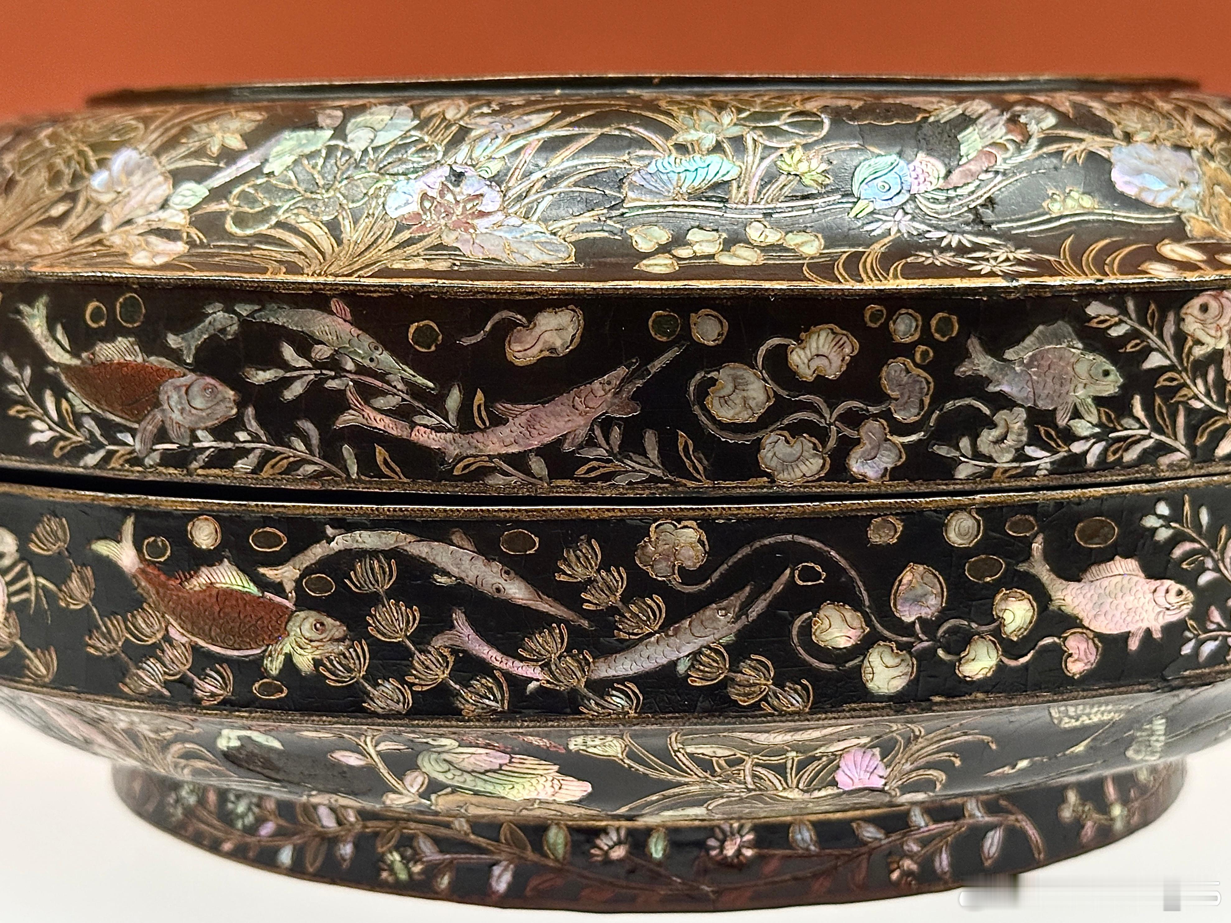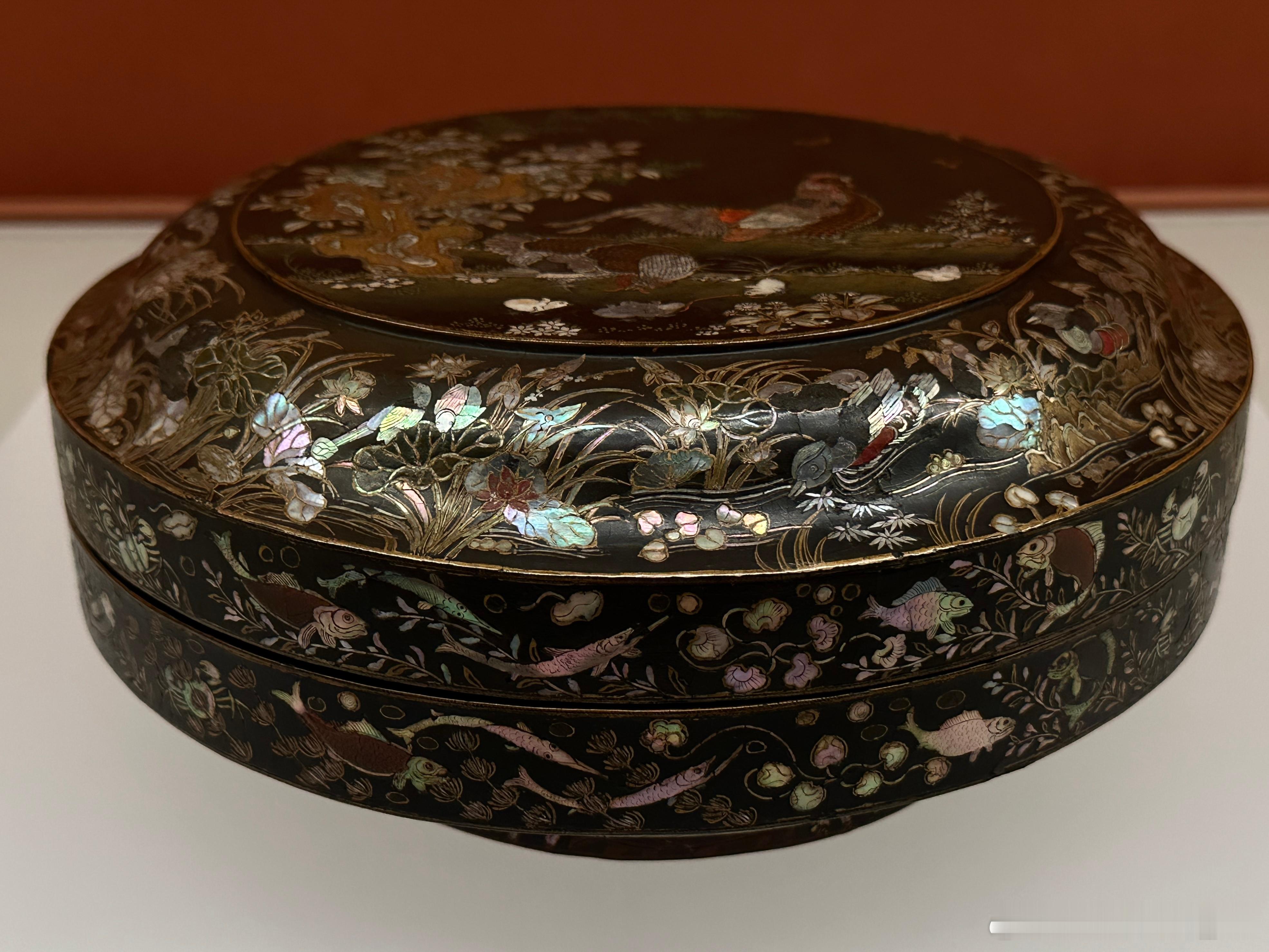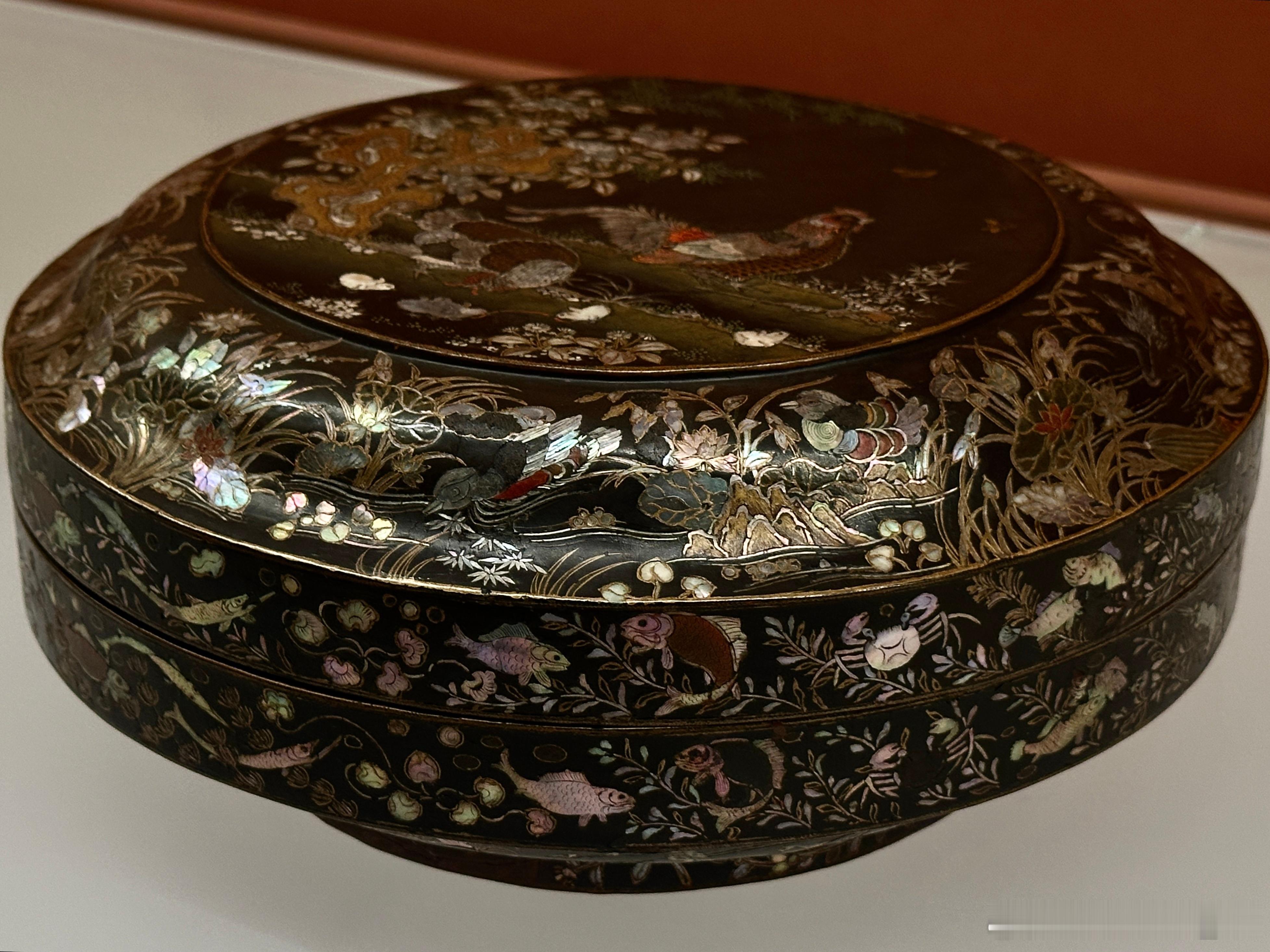 木胎,圆盒,圈足,通体髹黑漆。器表黑漆地上综合运用螺钿、彩漆和金箔等工艺。盖面生动地描绘了锦鸡一家在有太湖石和翠竹花草的庭院中优哉游哉的场景;盖肩及盒腹近圈足处为蝴蝶飞舞,鸳鸯、鸬鹚、鸭子在莲池中愉快地嬉戏的莲池水禽图;盖子和器身止口则描绘了鱼、蟹、水草等水中生物,圈足外侧是菊花、梅花等花卉。整个画面极具法度,又富有生气。