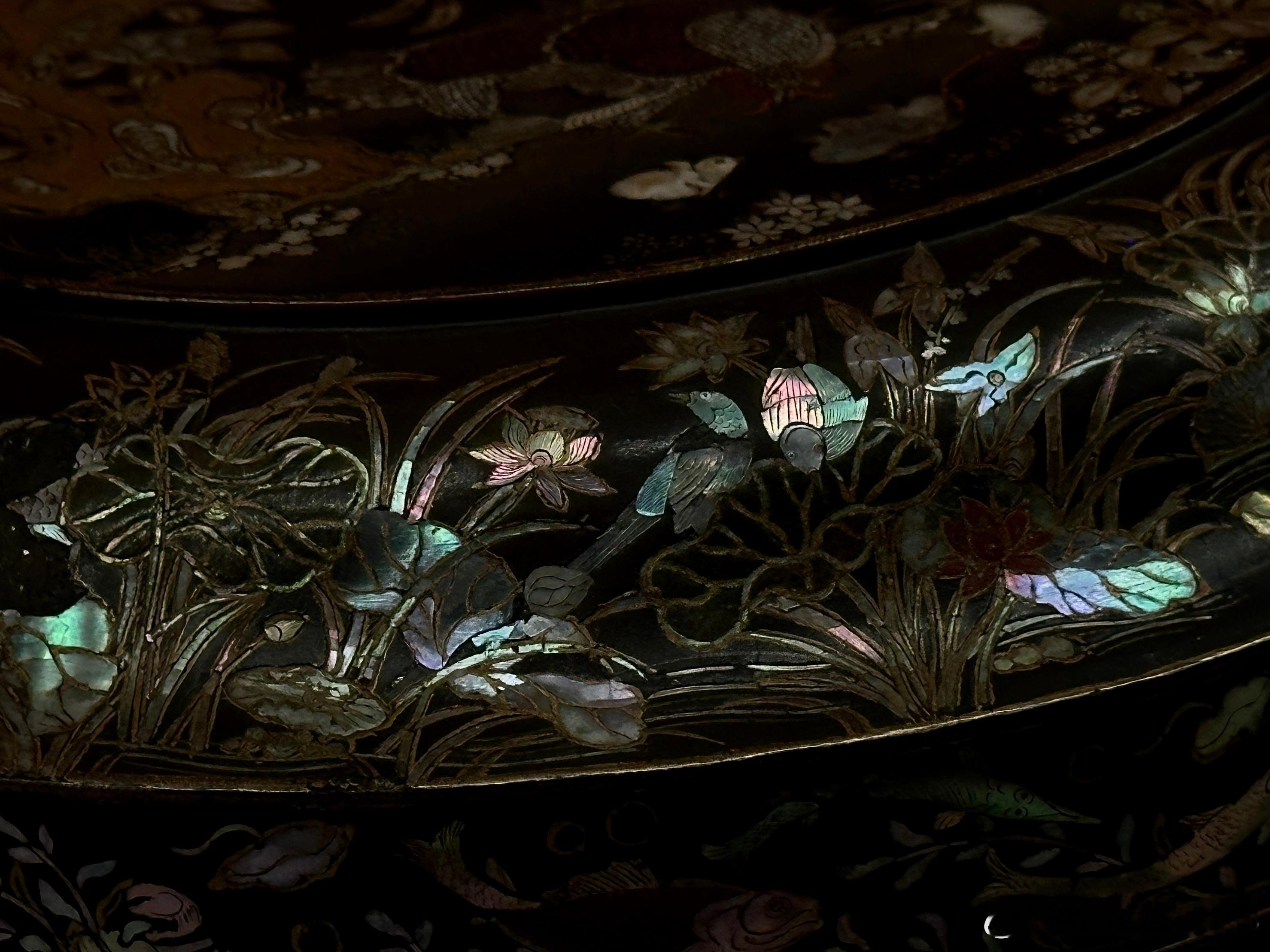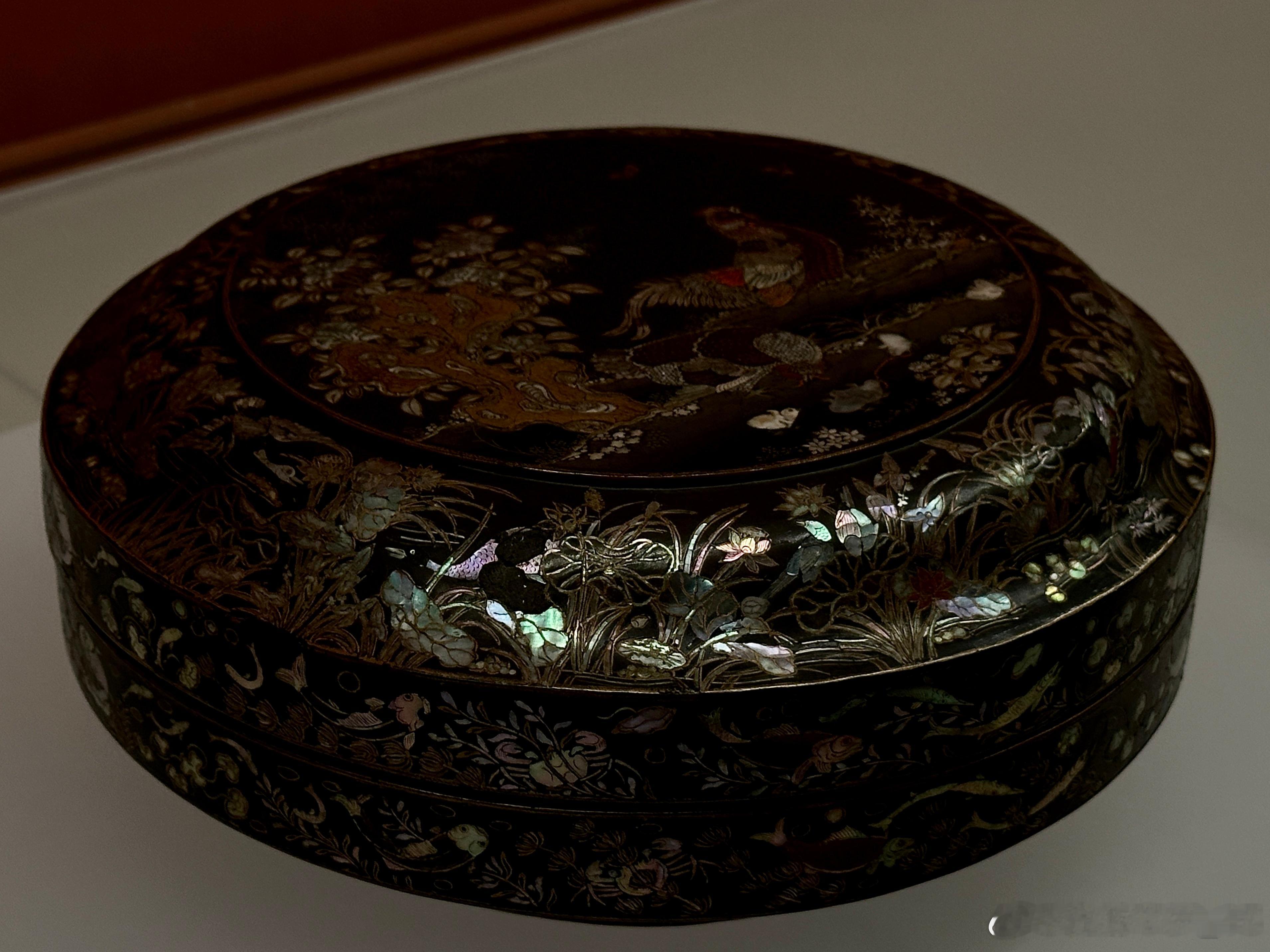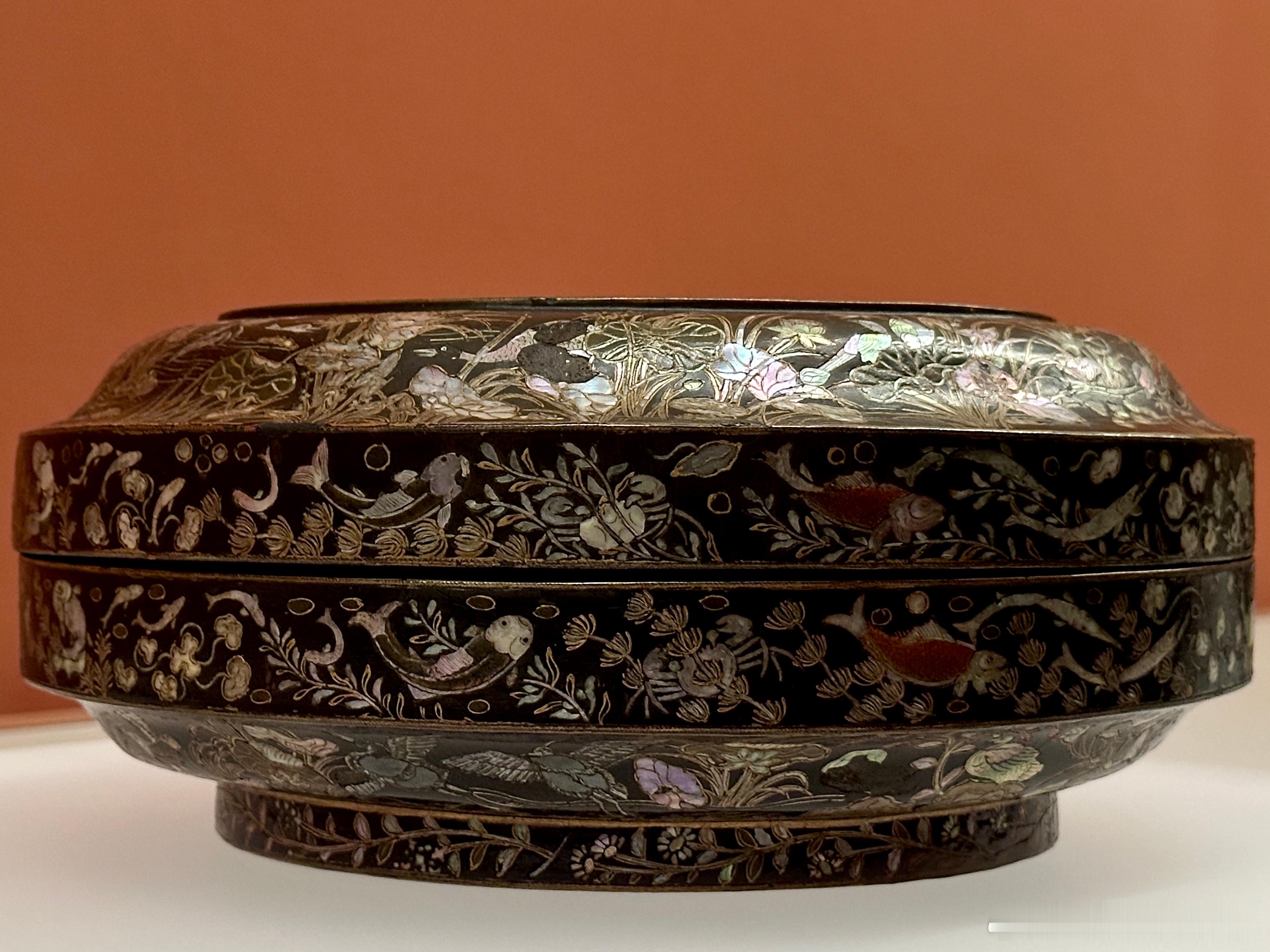 木胎,圆盒,圈足,通体髹黑漆。器表黑漆地上综合运用螺钿、彩漆和金箔等工艺。盖面生动地描绘了锦鸡一家在有太湖石和翠竹花草的庭院中优哉游哉的场景;盖肩及盒腹近圈足处为蝴蝶飞舞,鸳鸯、鸬鹚、鸭子在莲池中愉快地嬉戏的莲池水禽图;盖子和器身止口则描绘了鱼、蟹、水草等水中生物,圈足外侧是菊花、梅花等花卉。整个画面极具法度,又富有生气。
