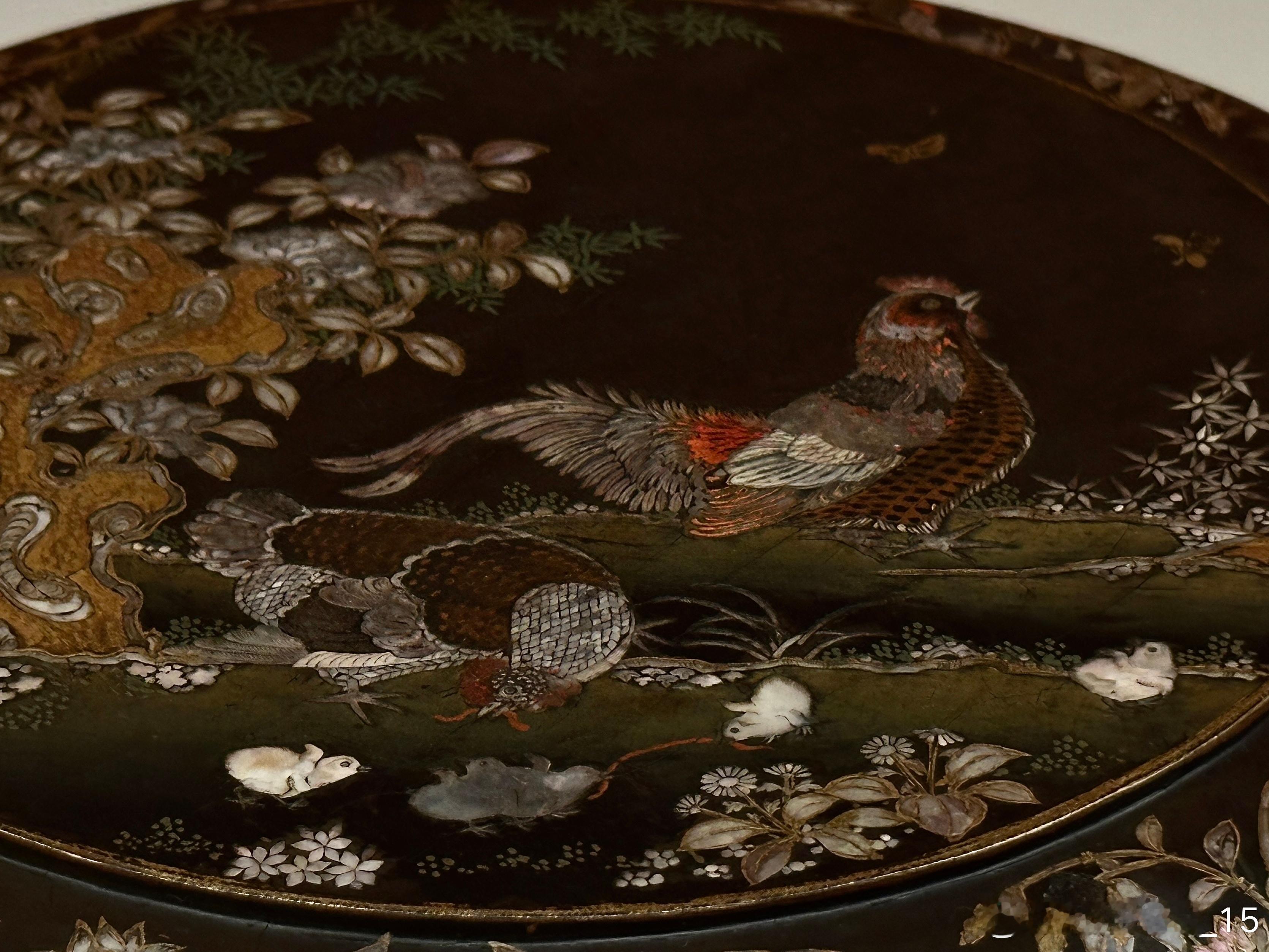 黑漆螺钿描金锦鸡花蝶图圆盒