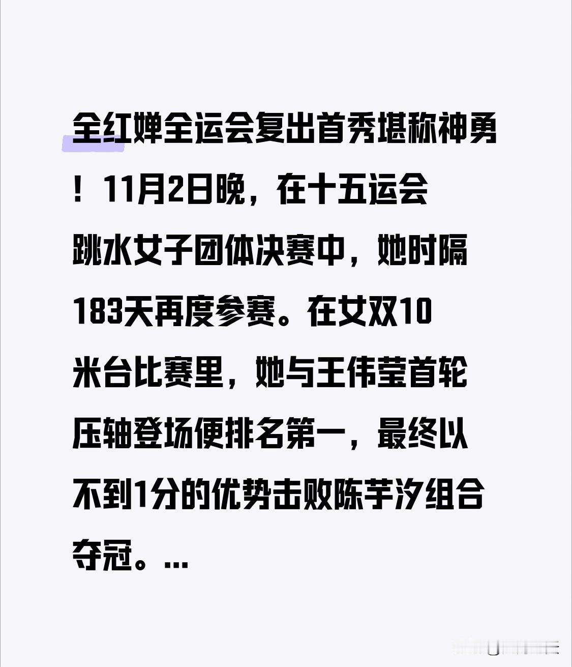 全红婵全运会复出首秀堪称神勇!11月2日晚,在十五运会跳水女子团体决赛中,她时隔183天再度参赛。在女双10米台比赛里,她与王伟莹首轮压轴登场便排名第一,最终以不到1分的优势击败陈芋汐组合夺冠。这一成绩助力广东队以2369.8分成功卫冕,拿下全运会跳水首金。 如此表现着实惊艳。要知道,她受伤停赛许久,却能迅速找回状态,其实力不容小觑。赛后,她在社媒发文“我真棒”,尽显自信与可爱。11月6日,她还将出战女双10米跳台,期待她继续带来精彩表现! 全红婵 全红婵勇夺冠 跳水冠军婵 全红婵世锦赛 全红婵写真 全红婵走秀 婵红婵