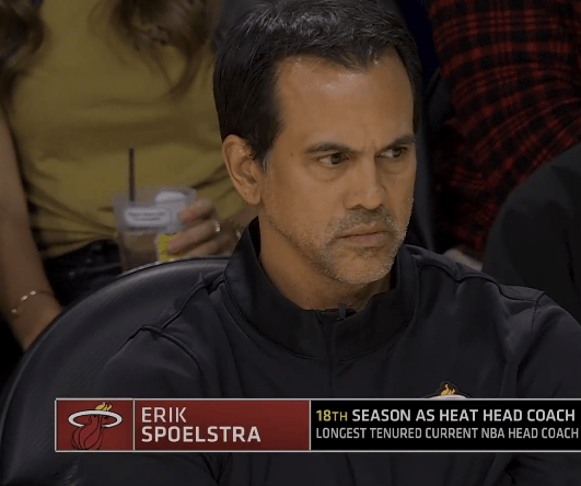 比赛的第一节,转播画面给到一组信息,热火主帅斯波尔斯特拉已作为主教练执教18个赛季,成为现役当中执教时间最长的主教练。