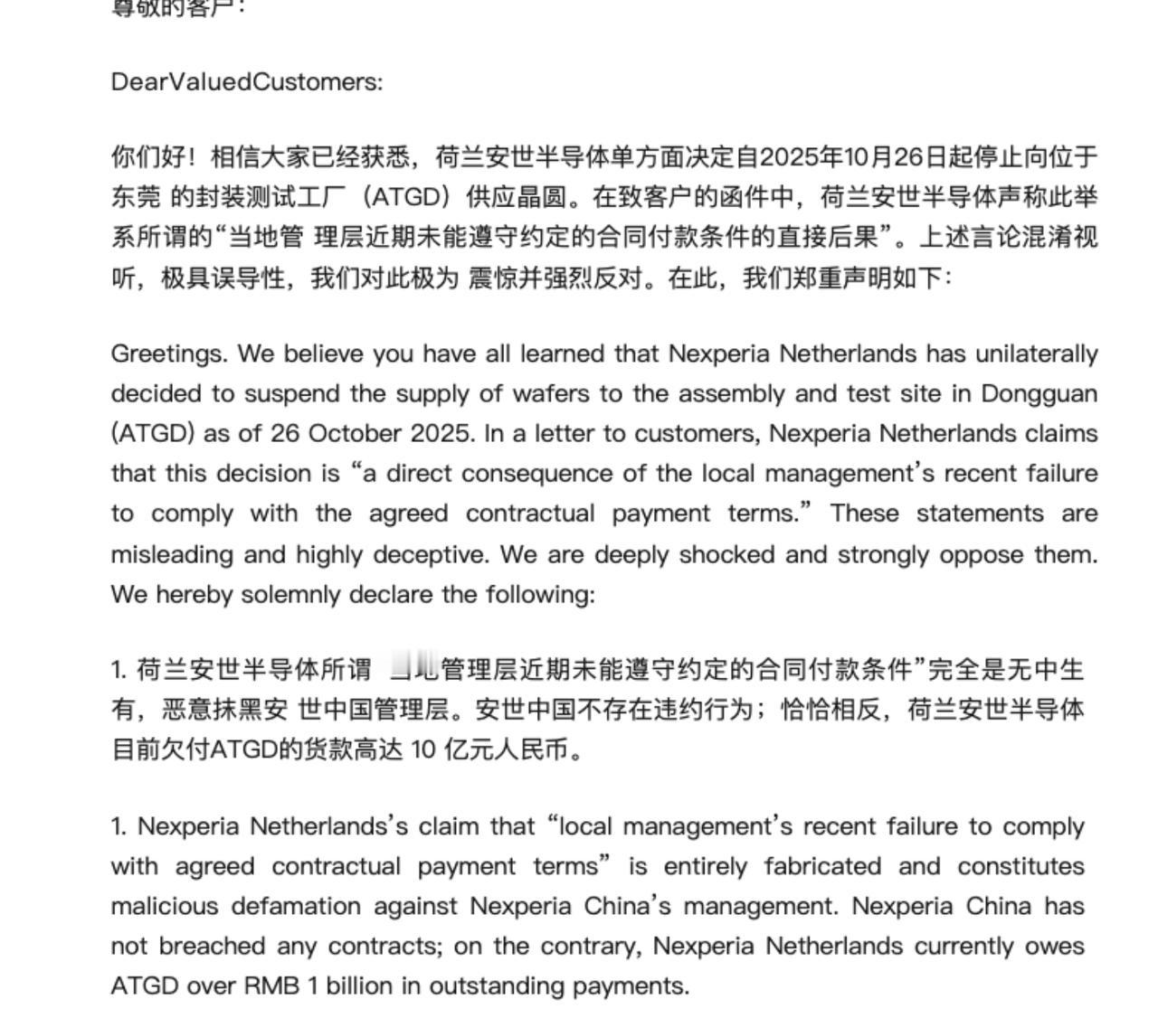 荷兰想对抗到底,中国奉陪!安世中国发布最强硬声明,这一次要彻底打服 荷兰居然还想做最后的抵抗,以为占着还有2座晶圆厂,就可以卡住安世中国的脖子,来一个玉石俱焚,既然荷兰想对抗到底,那么中国奉陪。 这一次安世中国发布了最强硬声明,首先宣布,安世中国手里的产品可以稳定供应到明年,如今安世中国已经在大陆找到了替代晶圆厂,完成验证之后,就可以无缝斜接。 安世中国的反击,可以说让荷兰妄图依靠晶圆厂,逼迫安世中国交货的妄想彻底破灭,中国拥有全球最完整的产业链,还会怕你断供晶圆,现在荷兰这边还要承担交不出货的巨额违约金。 而对于欧洲汽车产业来说,保持生产才是当务之急,既然安世中国可以供货,那为什么不选择安世中国,要知道,如果选择新的芯片产品,所有的汽车主机厂都要重新完成一遍标准的认定。这个过程相当麻烦,时间也很长。等于说安世中国将重新承接原有荷兰安世总部这边的客源。 同时结算方式由美元改为人民币,也实现了业务上的闭环。也就是说,未来即使出现最坏的结果,安世中国这边仍然可以独立运作。 这下荷兰就只抢到了一个空壳,不仅如此,美国暂停了对中国企业50%穿透性的制裁,荷兰方面对安世半导体的争夺已经越来越站不住脚,也就是说美国已经放弃了荷兰,荷兰现在面临极大的压力。 既然荷兰还需要对抗,那么我们就是时候杀鸡儆猴了,现在全世界都在看着,如果我们对荷兰姑息,那么就会出现下一个荷兰,到时候中国企业在海外的投资都会有不稳定的因素。 既然荷兰想对抗到底,那么我们就狠狠反制,打到他心服口服。