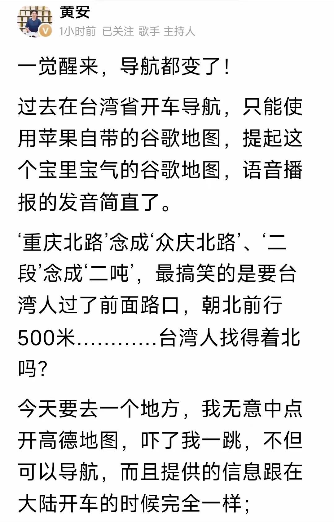 “台独”一觉醒来,发现天塌了!以前在台湾省开车,只能用苹果的谷歌地图,但是,知名歌手黄安这次回到台湾省,由于习惯,他直接打开高德地图,他本能的想关掉切换谷歌,结果,高德居然也可以导航了!而且提供的信息,和在大陆一模一样,连附近的便利店和停车场都标注得明明白白。   这声感叹背后,是台湾地区导航服务多年未有的变化。   在此之前,台湾民众开车导航,大多依赖苹果手机自带的谷歌地图,而这款地图的使用体验一直不尽如人意。   黄安本也习惯了这种不便,此次回台探亲开车出行,他下意识点开高德导航后,原本打算立刻切换到谷歌地图,却没想到高德不仅成功定位,还能顺畅提供导航服务。   让黄安更为意外的是,高德导航在台湾的使用体验,与他在大陆时毫无二致。   他特意点开卫星图查看,台湾岛上的每一条街道都清晰可辨,从繁华市区的主干道到居民区的小巷道,标注得一目了然。   不仅黄安有这样的惊喜体验,不少台湾网友和从业者在测试后,也纷纷给出正面反馈。   有网友表示,高德导航的定位格外稳定,数据精准度很高,甚至能找到一些不为人知的隐藏小巷。   从实际使用情况来看,高德导航在台湾的覆盖范围远超预期。   无论是人口密集的繁华市区,还是车流较少的偏远小路,几乎都能实现无遗漏覆盖。   除了街道标注清晰,便利店、停车场等生活服务设施也一一标注,极大提升了实用性。   这种全方位的覆盖,打破了以往台湾地区导航软件“重市区、轻郊区”的局限,让不同需求的使用者都能获得满意的体验。   这一变化的背后,是地图数据系统的持续互通与技术升级。   业内人士分析,高德导航能在台湾实现精准覆盖,核心在于地理信息数据的全面对接,而这背后离不开长期的技术积累与系统优化。   值得一提的是,这一技术突破并非孤立存在,此前“吉林一号”卫星公布的多张台湾高清影像,从宏观层面展现了宝岛的山海地貌,而高德导航则从微观层面实现了街巷楼宇的精准标注,两者相互呼应,共同完成了对台湾地区地理信息的全方位呈现。   不过,关于高德地图在台湾地区的具体运营细节,目前仍有一些待解之处。   截至目前,高德方面尚未就相关情况作出公开回应,具体的技术落地方式、数据更新机制等信息,仍需等待多方进一步确认。   但这并不影响民众对这一变化的认可,毕竟实实在在的使用体验,已经给出了最有说服力的答案。   地理信息的无缝对接,从来都不只是技术层面的突破。   高德导航在台湾的顺利使用,本质上是台湾省作为中国领土不可分割一部分的生动印证——当一款大陆的导航软件,能精准覆盖台湾的每一条街巷、每一处设施,当两岸的地理数据实现无障碍互通,这份跨越海峡的连接,早已超越了技术本身的意义。   黄安那句“一觉醒来,导航都变了”,不仅是对一款软件的认可,更道出了两岸融合发展的必然趋势。   这种融合,没有轰轰烈烈的宣传,却在日常生活的细微之处悄然发生,让两岸民众的联系变得更加紧密、更加自然。   如今,越来越多的台湾民众开始体验到两岸融合带来的便利,高德导航的普及只是其中一个缩影。   当导航软件能顺畅指引海峡两岸的路途,当地理数据能无缝衔接宝岛与大陆,那些企图割裂两岸的图谋,在这样的现实面前,显得格外苍白无力。   而这一切,都只是一个开始,随着两岸融合发展的不断深入,相信会有更多便利走进两岸民众的生活,让彼此的联系更加密不可分。   今天的分享到这里就结束了,大家对此事有何看法,欢迎在评论区留言和讨论,感兴趣的可以点击头像加关注,我将每日更新优质内容,我们下期见。