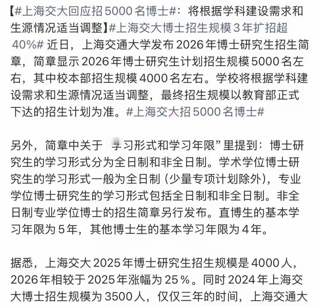 上海交通大学2026年准备招收5000个博士!吐槽声四起。我倒是希望医学博士能扩招,毕竟有的博导只招一两个名额。想读博的申博太难了。 学医儿子读研二,执业医师考试通过后,又迎来了新的焦虑。就是读博深造。 由于儿子的导师只是硕导,还不是博导。而且打听了一下,博导招的人数很少,不是特别优秀又想读博,该怎么办? 自己的硕导不是博导的学生,读博的可能性很小。而那些本来就是博导的硕导,又更倾向于自己带的学生,另找博导的研究生相对不占优势。 学医想读博的相对多一些,要是扩招些,兴许还有希望读上博。 专业硕士,在毕业时就能拿到规培证书,考主治还要两年后才能考。专博毕业后,直接评主治。可以说读博就迟了一年评主治。 不管就业还是待遇,博士明显高于硕士,有志于学医的人一定做好读博的准备。