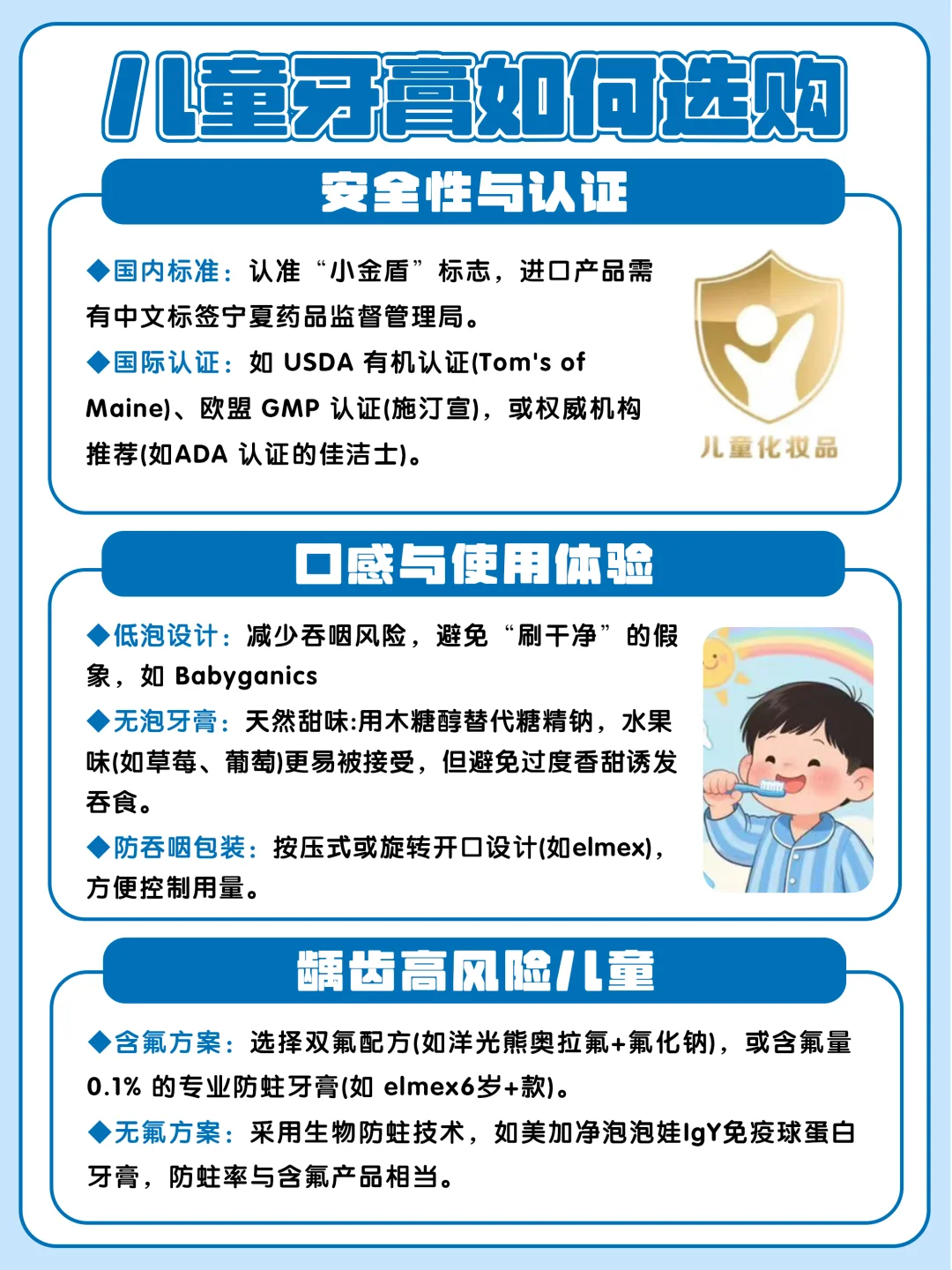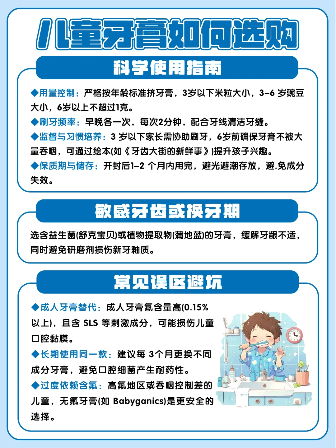 最后划重点:含氟是防蛀核心,控量是安全关键,选对成分+孩子喜欢,刷牙才能变成轻松事~